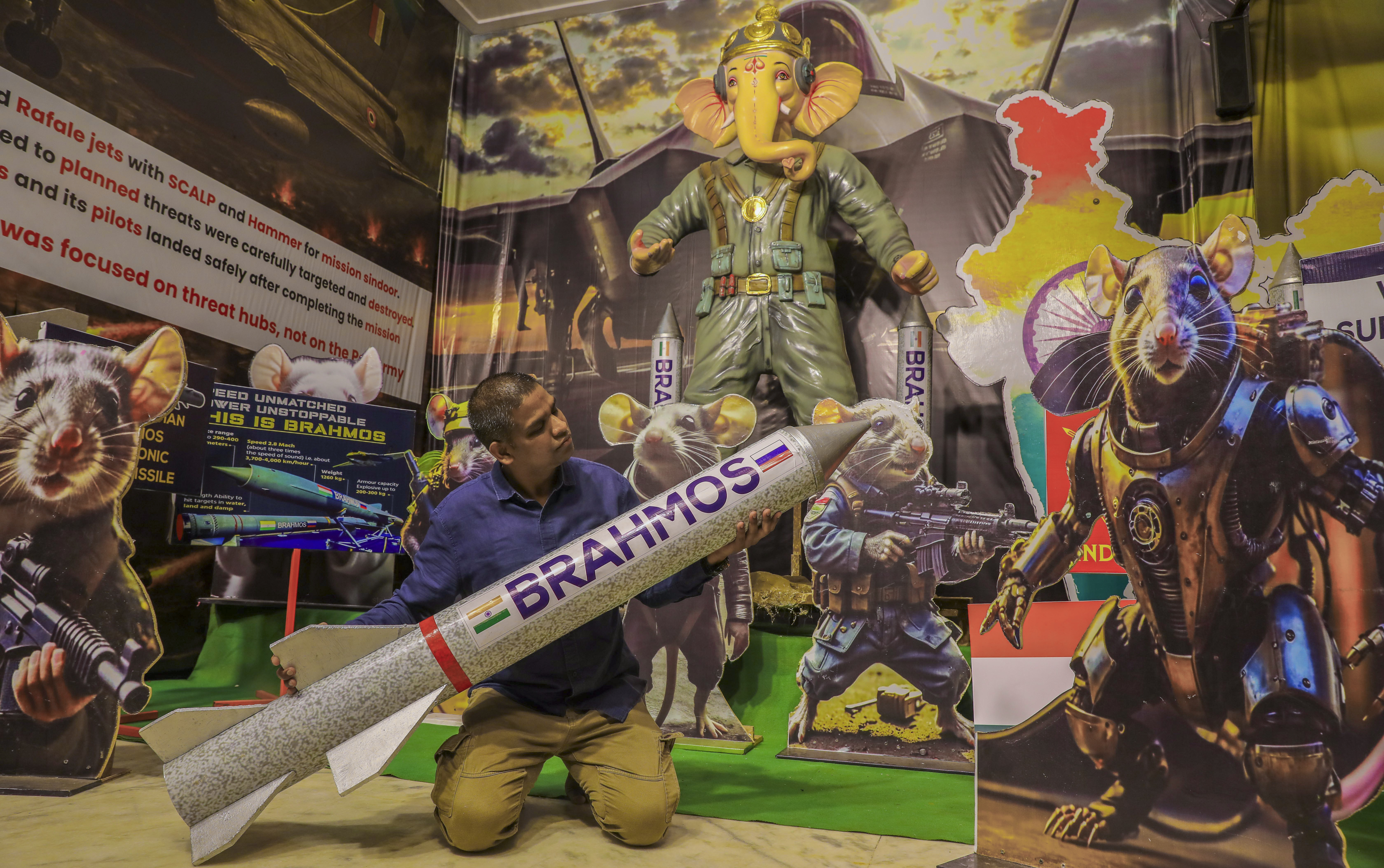 हैदराबाद से गणपति की एक तस्वीर वायरल हो रही है। जहां गणेश चतुर्थी 2025 के अवसर पर भगवान गणेश की एक अनोखी प्रतिमा सजाई गई है। इस मूर्ति की खासियत यह है कि इसे भारतीय सेना के साहसिक ऑपरेशन 'सिंदूर' और ब्रह्मोस मिसाइल की थीम पर बनाया गया है।