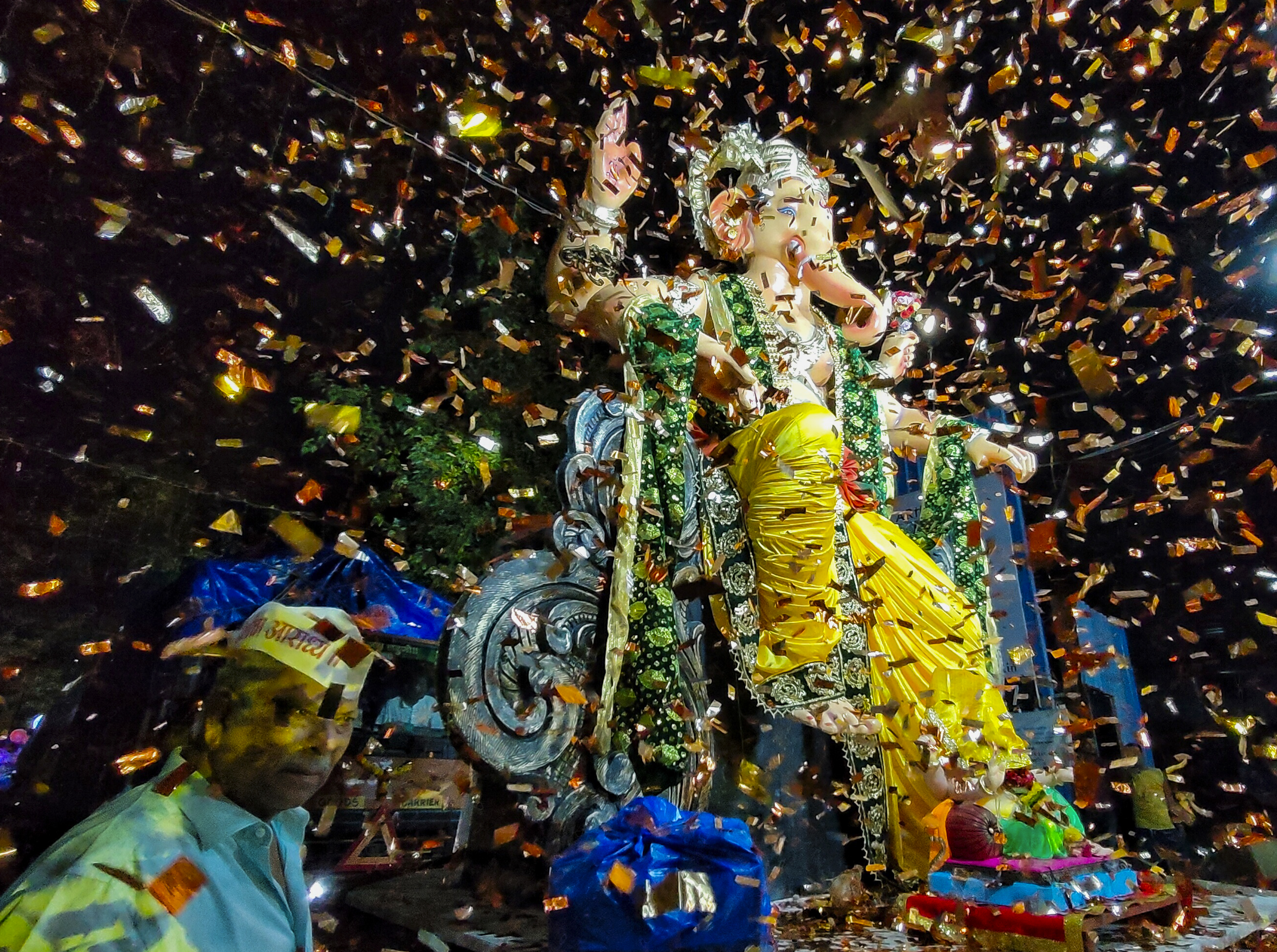 इस मूर्ति की खास बात यह है कि इसमें भगवान गणेश को पारंपरिक परिधान और चमकदार आभूषणों से सजाया गया है। पीला कपड़ा समृद्धि और ऊर्जा का प्रतीक माना जाता है। चारों ओर उड़ती रंग-बिरंगी कंफेटी और रोशनी माहौल को और भी आनंदमय बना रही हैं।