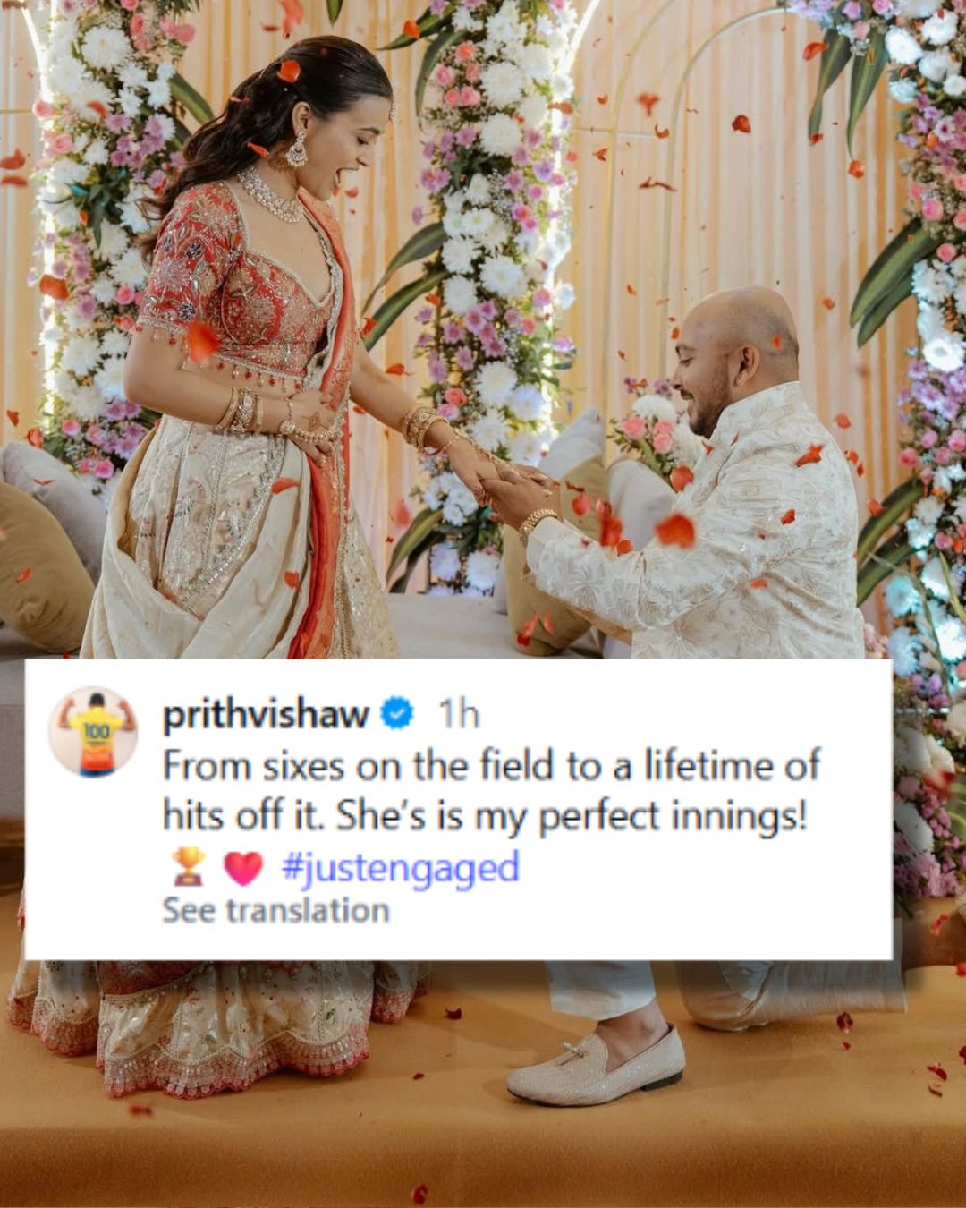 पृथ्वी शॉ ने इंस्टाग्राम पर आकृति अग्रवाल के साथ कई रोमांटिक तस्वीरें पोस्ट कीं। उन्होंने तस्वीरों को कैप्शन दिया, 'मैदान पर छक्के मारने से लेकर जिंदगी भर उसके साथ रहने तक, वह मेरी परफेक्ट पारी है।' उनकी इस पोस्ट पर सोशल मीडिया पर फैंस और क्रिकेट के शौकीनों की तरफ से खूब रिएक्शन आए।