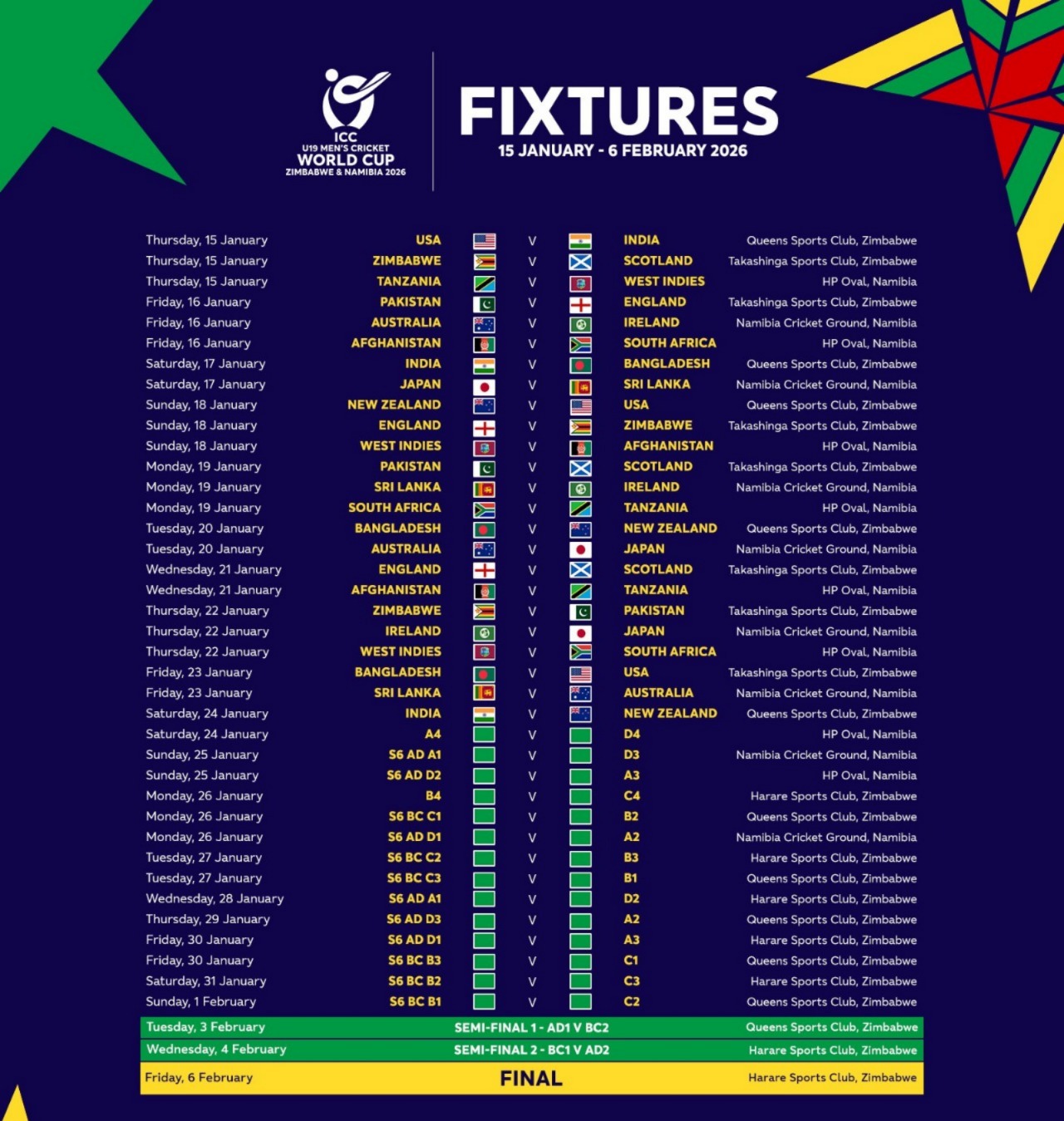 इंटरनेशनल क्रिकेट काउंसिल (ICC) ने अंडर-19 वर्ल्ड कप 2026 का शेड्यूल जारी कर दिया है। यह टूर्नामेंट 15 जनवरी से 6 फरवरी तक जिम्बाब्वे और नीमीबिया की मेजबानी में खेला जाएगा। जिम्बाब्वे का हरारेस्पोर्ट्सक्लबफाइनलहोस्ट करेगा। इस बार के अंडर-19 वर्ल्ड कप में 16 टीमें हिस्सा ले रही हैं, जिन्हें 4 ग्रुप में बांटा गया है। भारत, न्यूजीलैंड, बांग्लादेश और अमेरिका के साथ ग्रुप-ए में है। टूर्नामेंट का उद्घाटन मुकाबला भारत और अमेरिका के बीच खेला जाएगा।