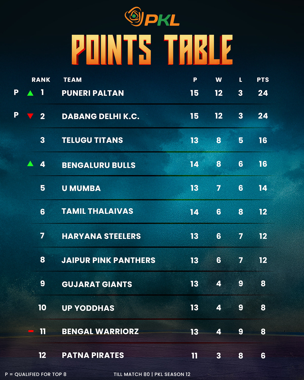 प्रो कबड्डी लीग (PKL) के 12वें सीजन के 80वें मैच में बेंगलुरुबुल्स नेबंगाल वॉरियर्स को हरा दिया। दिल्ली के त्यागराजइंडोर स्टेडियम में रविवार (12 अक्टूबर) को खेले गए इस मुकाबले में बेंगलुरुबुल्स ने 43-32 के बड़े अंतर से जीत दर्ज की। बेंगलुरुबुल्स की यह लगातार तीसरी जीत रही। उसने जीत की हैट्रिक लगाकर पॉइंट्सटेबल में एक पायदान की छलांग लगाई है। बेंगलुरुबुल्स 14 मैचों में 16 पॉइंट्स के साथ टेबल में टॉप-4 में पहुंच गई है।