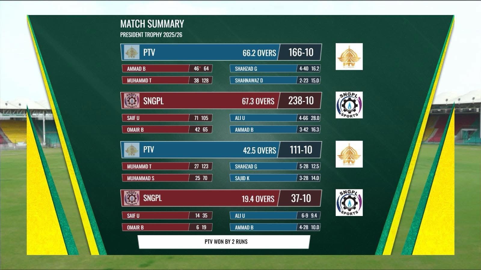 PTV की टीम अपनी पहली पारी में महज 166 रन पर सिमट गई थी। जवाब में SNGPL ने 238 रन बनाए और 72 रन की बढ़त हासिल कर ली। इसके बाद PTV की टीम अपनी दूसरी पारी में भी 111 रन ही बना पाई। इस तरह SGNPL को सिर्फ 40 रन का लक्ष्य मिला, जिसका पीछा करते हुए वह 19.4 ओवर में 37 रन पर ऑलआउट हो गई। इसके साथ ही PTV ने फर्स्ट क्लास क्रिकेट के इतिहास में सबसे छोटे टारगेट को डिफेंड करने का 232 साल पुराना रिकॉर्ड तोड़ दिया।