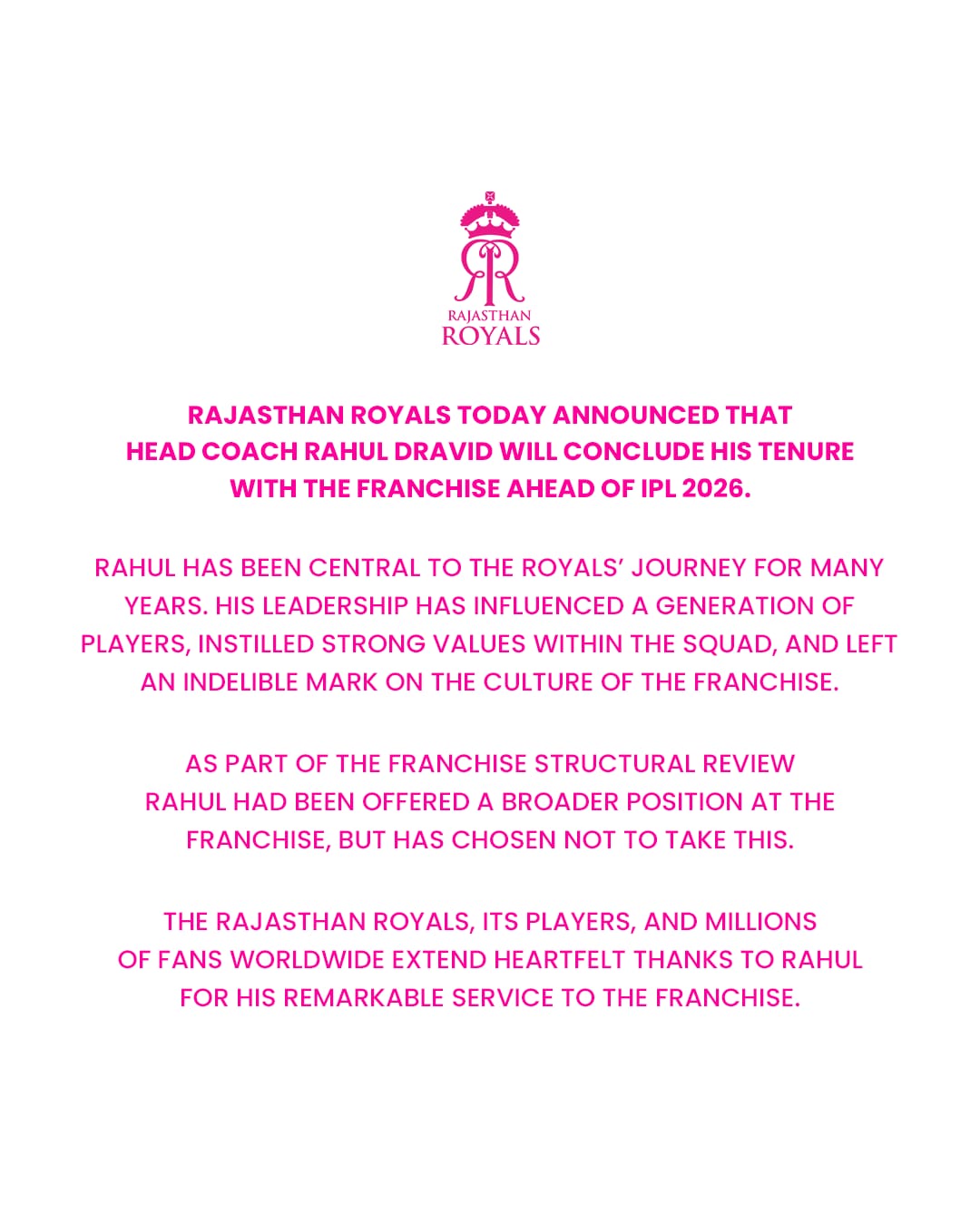 राजस्थान रॉयल्स ने अपने बयान में जिक्र नहीं किया कि द्रविड़ क्यों इस्तीफा दे रहे हैं। उसने कहा कि द्रविड़ को बड़ा पद ऑफर किया गया था लेकिन उन्होंने स्वीकार नहीं किया। समझा जा रहा है कि उन्हें हेड कोच की भूमिका से हटाकर यह पद सौंपा जा रहा था। खबरों के मुताबिक, आईपीएल 2025 में टीम के खराब प्रदर्शन के बाद द्रविड़ के लिए एक तरह से यह सजा जैसा था, जिसके चलते उन्होंने फ्रेंचाइजी से नाता तोड़ लिया।
