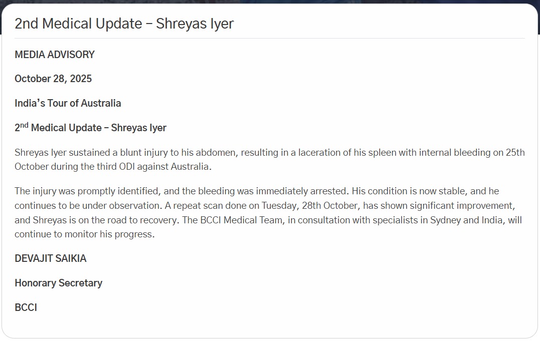 BCCI ने एक आधिकारिक बयान जारी कर अय्यर की हालत के बारे में जानकारी दी है। BCCI ने बताया कि '25 अक्टूबर को ऑस्ट्रेलिया के खिलाफ तीसरे वनडे के दौरान उन्हें पेट में गंभीर चोट लगी, जिससे उनकी तिल्ली में चोट लग गई और इंटरनल ब्लीडिंग भी हुई।'