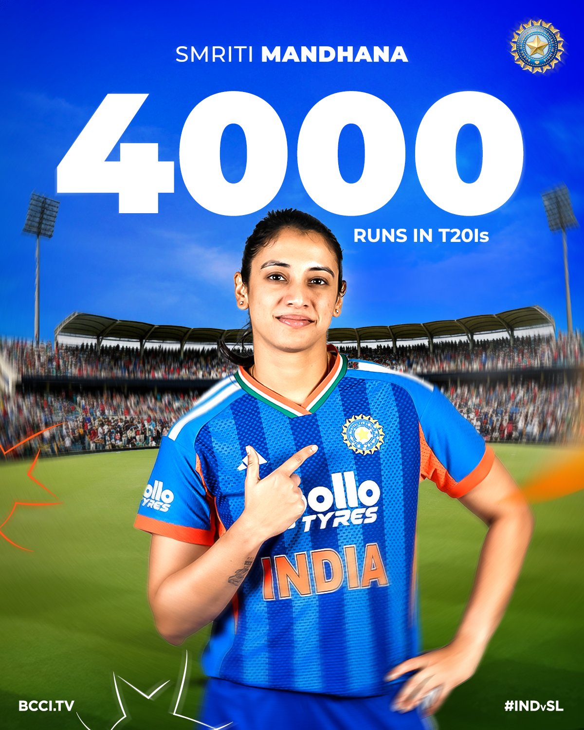 स्मृति के इंटरनेशनल टी-20 क्रिकेट करियर की बात करें तो वह अब तक 154 मुकाबलों की 148 पारियों में खेल चुकी हैं। इस दौरान उन्होंने 29,90 की औसत के साथ 4,007 रन बनाए हैं। इन मैचों में स्मृति ने एक शतक और 31 अर्धशतक लगाए है। कल उन्होंने इंटरनेशनल टी 20 क्रिकेट में 4,000 रनों का आंकड़ा पार कर लिया। ऐसा करने वाली वह पहली भारतीय महिला और पूरे विश्व में दूसरी महिला बन गई हैं। इससे पहले सबसे ज्यादा रन बनाने का रिकॉर्ड न्यूजीलैंड की सूजी बेट्स के नाम है, जिन्होंने 177 मुकाबलों में 29.11 की औसत के साथ 4,716 रन बनाए हैं। सूजी इस फॉर्मेट में 1 शतक और 28 अर्धशतक लगा चुकी हैं। स्मृति उनसे करीब 700 रन पीछे हैं।