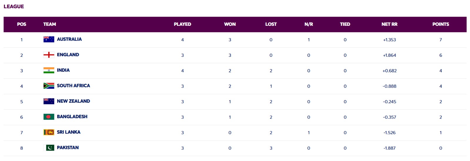 महिला वर्ल्ड कप 2025 पॉइंट्स टेबल। (Photo Credit: ICC)