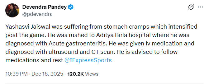 टाइम्स ऑफ इंडिया की रिपोर्ट के अनुसार, यशस्वी जायसवाल को गैस्ट्रोएंटेराइटिस यानी पेट और आंतों की परत में होने वाली सूजन के कारण दर्द हुआ था। इसे अक्सर पेट का फ्लू भी कहा जाता है और यह वायरस या बैक्टीरिया के कारण होता है। यशस्वी जायसवाल की तबीयत मंगलवार शाम अचानक खराब हुई थी और इसके बाद उन्हें अस्पताल में भर्ती करवाया गया था। अस्पताल ले जाने के बाद यशस्वी जायसवाल को ड्रिप के जरिए दवाएं दी गई और अल्ट्रासाउंड और सीटी स्कैन भी किया गया। डॉक्टरों ने उन्हें आराम करने की सलाह दी है।