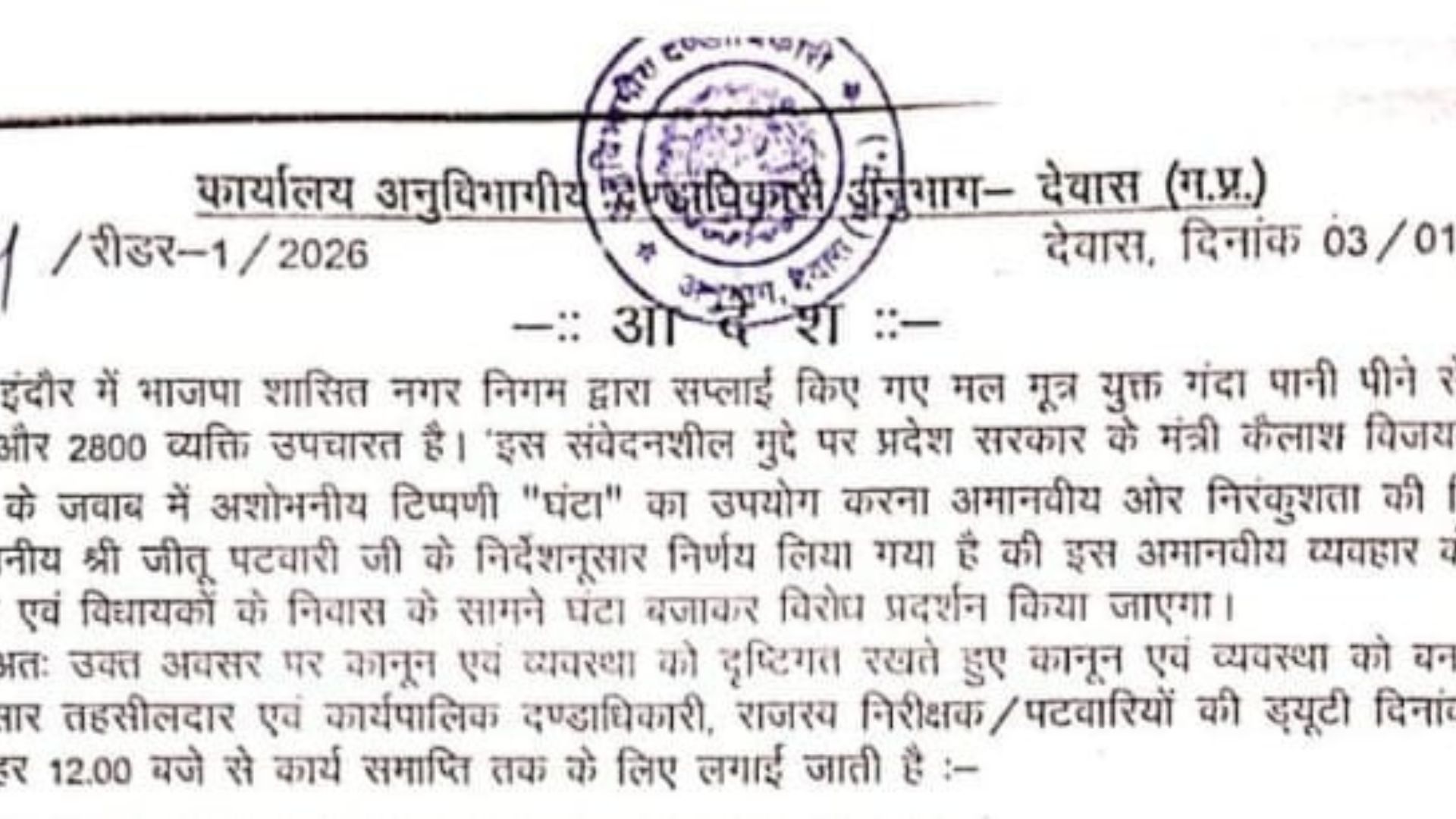मध्य प्रदेश के इंदौर शहर में गंदा पानी पीने से करीब आधा दर्जन लोगों की मौत हो चुकी है। वहीं अब तक लगभग 2800 लोगों के बीमार होने की जानकारी सामने आई है। इस मामले को लेकर कांग्रेस लगातार सरकार पर हमला बोल रही है। इसी को लेकर रविवार (4 जनवरी) को कांग्रेस नेताओं ने देवास विधायक गायत्री राजे पवार और हाटपीपल्या विधायक मनोज चौधरी समेत कई नेताओं के खिलाफ प्रदर्शन किया था। इस प्रदर्शन की अनुमति देने वाले देवास के SDM आनंद मालवीय को 24 घंटे के भीतर निलंबित कर दिया गया। कहा जा रहा है कि जारी आदेश में कांग्रेस के ज्ञापन के शब्दों का हूबहू इस्तेमाल किया गया था।