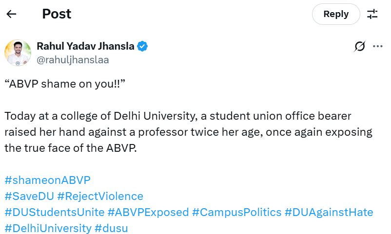 डूसू के उपाध्यक्ष और नेशनल स्टूडेंट्स यूनियन ऑफ इंडिया से जुड़े राहुल झांसला यादव ने इस मुद्दे को लेकर एबीवीपी पर निशाना साधते हुए उसे 'गुंडा पार्टी' बताया। उन्होंने कहा कि एबीवीपी के कार्यकर्ता लोकप्रियता के लिए प्रोफेसरों पर हमला कर रहे हैं और सरेआम गुंडागर्दी कर रहे हैं। उन्होंने कहा कि दिल्ली यूनिवर्सिटी में एबीवीपी की गुंडागर्दी का शिकार पहले सिर्फ छात्र ही होते थे लेकिन अब प्रोफेसर भी इसके शिकार हो रहे हैं। राहुल ने वाइस चांसलर से दीपीका झा और उनके साथियों को सस्पेंड करने की मांग की है।