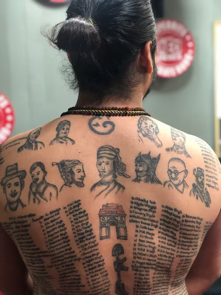 अभिषेक गौतम ने बताया, 'मेरे शरीर पर गुदे हुए नाम उन 559 वीर जवानों के हैं जिन्होंने कारगिल में देश की रक्षा करते हुए अपने प्राणों की आहुति दी। 11 महापुरुषों की तस्वीरें हैं जिनकी कहानियां हम बचपन से किताबों में पढ़ते आ रहे हैं, जिनमें चंद्रशेखर आजाद, भगत सिंह, सुभाष चंद्र बोस, गुरु गोविंद सिंह, महारानी लक्ष्मीबाई, चाणक्य और महात्मा गांधी शामिल हैं। मैंने इंडिया गेट और शहीद स्मारक की सभी तस्वीरें अपने शरीर पर गुदवाई हैं। मैं सभी देशवासियों को स्वतंत्रता दिवस की शुभकामनाएं देना चाहता हूं।'