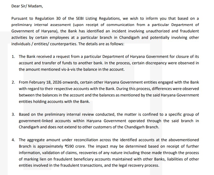 इस मामले का खुलासा तब हुआ जब हरियाणा सरकार के एक डिपार्टमेंट ने बैंक से अपना खाता बंद करने और पैसे किसी दूसरे बैंक में ट्रांसफर करने का अनुरोध किया। बैंक ने जब इसके लिए प्रक्रिया शुरू की तो बैंक को पता चला है बैंक में बताई गई राशि और कुल राशि में अंतर है। बैंक ने साफ किया है कि यह धोखाधड़ी सिर्फ चंडीगढ़ ब्रांच में हरियाणा सरकार से जुड़े कुछ खास खातों तक ही सीमित है। इसका असर बैंक के दूसरे ग्राहकों पर नहीं पड़ेगा।