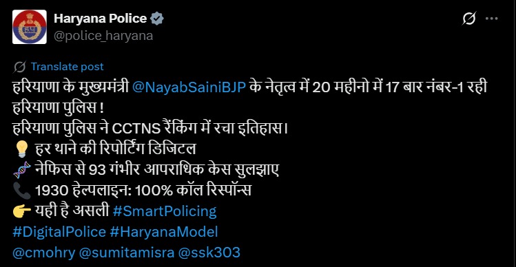 20 महीने में यह 17वीं बार है जब हरियाणा को डिजिटल पुलिसिंग रैंकिंग में 100% स्कोर मिला है। वहीं, अगस्त और सितंबर 2024 में हरियाणा पुलिस 99.99% के साथ तीसरे नंबर पर रही थी।