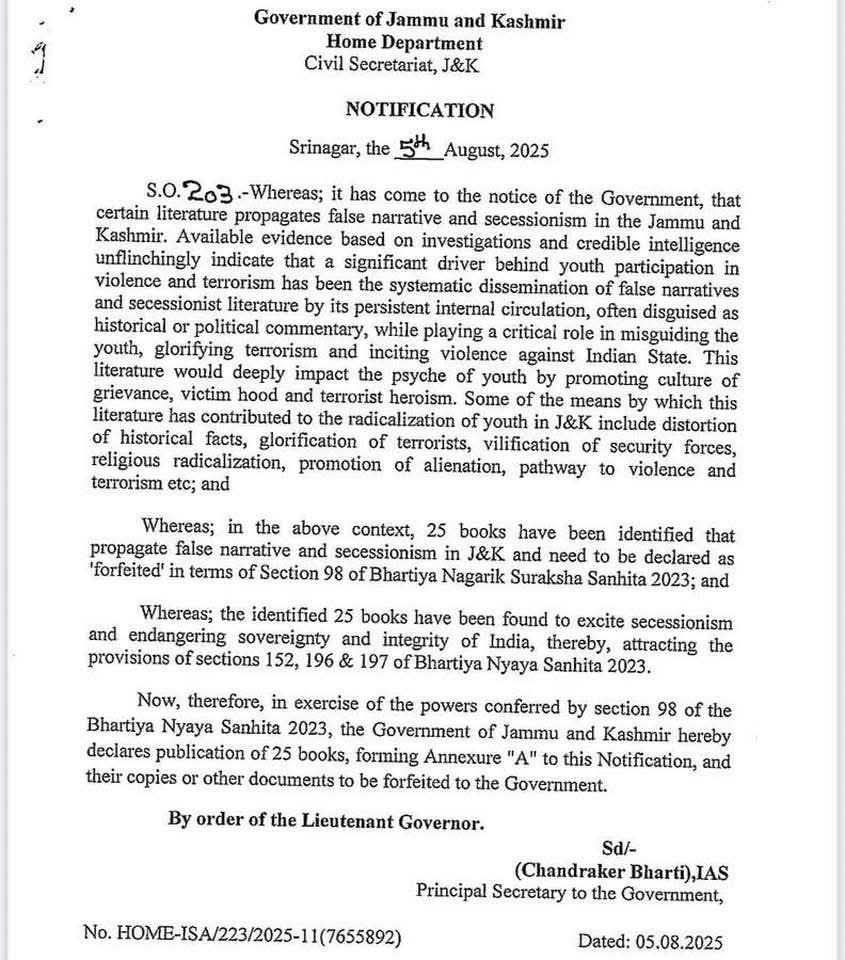 गृह मंत्रालय ने भारतीय नागरिक सुरक्षा संहिता (बीएनएस) की धारा 98 के तहत इन 25 किताबों को बैन किया है। गृह मंत्रालय की ओर से जारी आदेश में कहा, 'सरकार के संज्ञान में आया है कि कुछ किताबें जम्मू-कश्मीर में झूठे नैरेटिव और अलगवाद का प्रचार करती हैं। ये किताबें भारत की संप्रभुता और अखंडता को खतरे में डालने वाली पाई गई हैं, इसलिए इन पर भारतीय न्याय संहिता 2023 की धारा 152, 196 और 197 के प्रावधान लागू होते हैं।'
