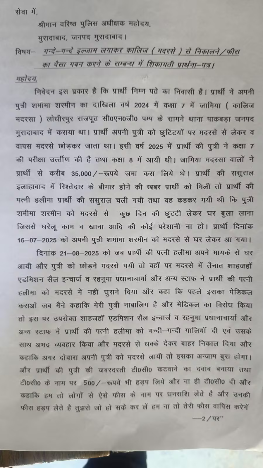 बच्ची के पिता मोहम्मद यूसुफ ने मामले को लेकर SSP मुरादाबाद से लिखित शिकायत की है। शिकायत में पीड़ित ने आरोप लगाया कि उनकी बेटी की मर्यादा का अपमान किया गया। यूसुफ ने पुलिस को वह ट्रांसफर सर्टिफिकेट (TC) फॉर्म भी दिखाया, जिसमें मेडिकल रिपोर्ट लाने की बात लिखी हुई है।