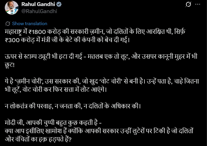 कांग्रेस सांसद राहुल गांधी ने आरोप लगाया कि 'महाराष्ट्र में 1,800 करोड़ रुपये की सरकारी जमीन जो दलितों के लिए थी, उसे सिर्फ 300 करोड़ में मंत्री जी के बेटे को बेच दिया गया।' उन्होंने कहा, 'यह जमीन चोरी उस सरकार की है, जो खुद वोट चोरी से बनी है।'