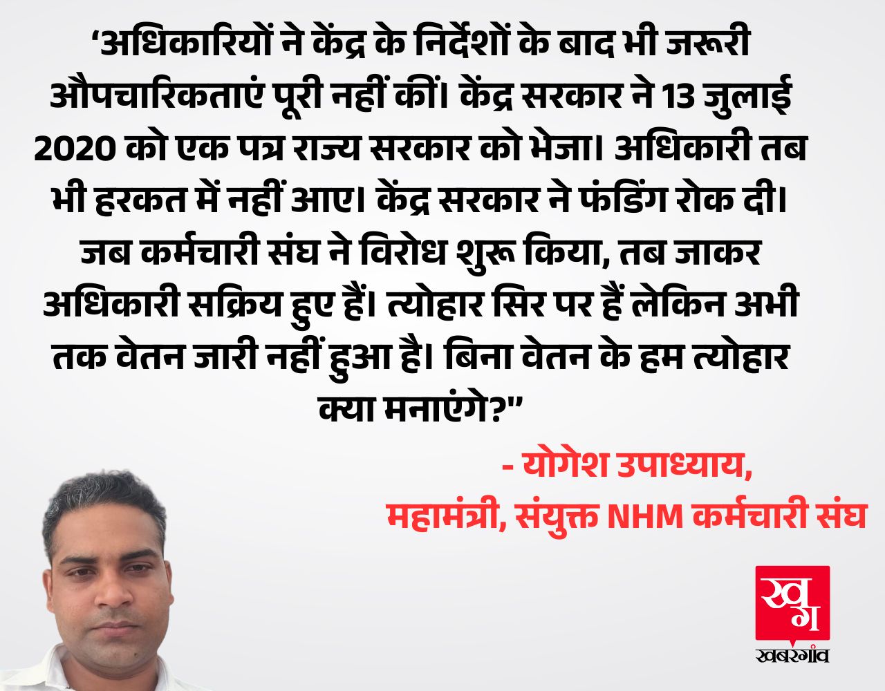 संयुक्त राष्ट्रीय स्वास्थ्य मिशन कर्मचारी संघ के महामंत्री योगेश उपाध्याय ने कहा, 'अधिकारियों ने केंद्र के निर्देश के बाद भी जरूरी औपचारिकताएं पूरी नहीं कीं। केंद्र सरकार ने 13 जुलाई 2023 को एक पत्र राज्य सरकार को भेजा। अधिकारी तब भी हरकत में नहीं आए। केंद्र सरकार ने फंडिंग रोक दी। जब कर्मचारी संघ ने विरोध शुरू किया, तब जाकर अधिकारी सक्रिय हुए हैं। त्योहार सिर पर हैं लेकिन अभी तक वेतन जारी नहीं हुआ है। बिना वेतन के हम त्योहार क्या मनाएंगे?'