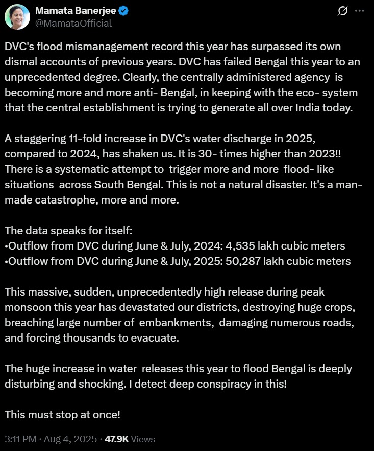 उन्होंने X पर लिखा था, 'DVC ने जानबूझकर मैथन और पंचेत बांधों से 1.50 लाख क्यूसेक से ज्यादा पानी छोड़ा है, ताकि त्योहारों के समय पश्चिम बंगाल में बाढ़ लाई जाए। यह हमें आपदा में डालने और लाखों लोगों को पूजा के दौरान दुख पहुंचाने की सुनियोजित साजिश है। यह शर्मनाक, असहनीय और अस्वीकार्य है, जिसका हम विरोध करते हैं।'