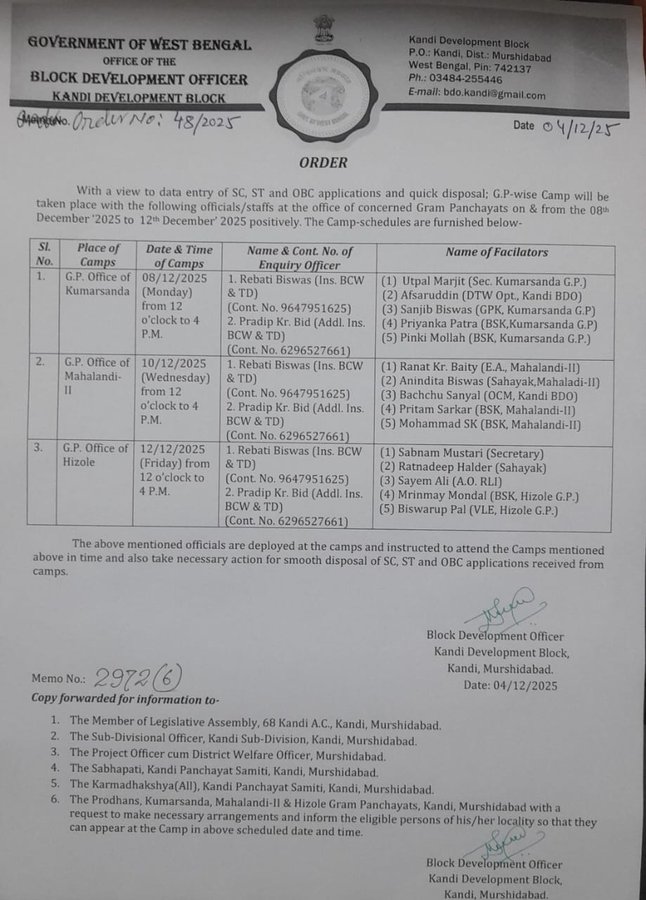 शुभेंदु अधिकारी ने पश्चिम बंगाल के मुर्शिदाबाद जिले के कंडी में पंचायत कार्यालयों में 8 से 12 दिसंबर तक ऐसे तीन शिविरों के बारे में जारी ब्लॉक डेवलपमेंट ऑफिसर के नोटिस को शेयर किया है। इस नोटिस को शेयर करते हुए उन्होंने आरोप लगाया कि सरकार घुसपैठियों को सर्टिफिकेट जारी कर रही है। उन्होंने चुनाव आयोग से मांग की है कि 24 जून के बाद जारी सभी सर्टिफिकेट की बारीकी से जांच की जाए। बता दें कि बिहार में 24 जून से ही SIR प्रक्रिया शुरू की गई थी।