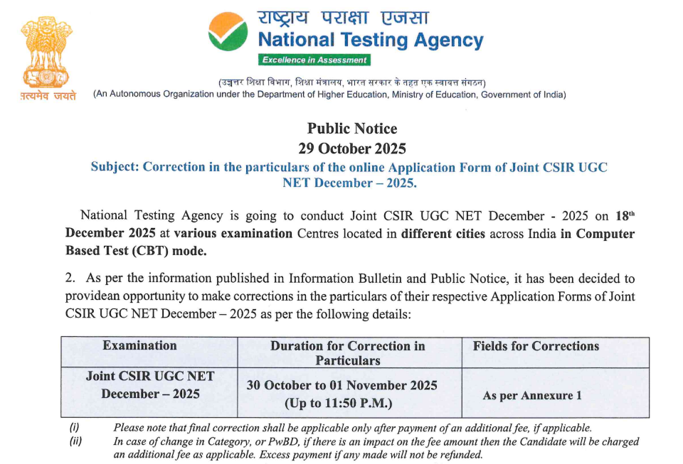 CSIR UGC-NET की परीक्षा के रजिस्ट्रेशन फॉर्म में सुधार करने के लिए नेशनल टेस्टिंग एजेंसी ने करेक्शन विंडो खोल दी है। अगर किसी उम्मीदवार से रजिस्ट्रेशन फॉर्म में कोई गलती हो गई है तो वह इस मौके का फायदा उठाकर अपनी गलती सुधार सकता है। नेशनल टेस्टिंग एजेंसी ने सुधार के लिए 30 अक्टूबर यानी आज से 1 नवंबर तक का समय दिया है। यह परीक्षा 18 दिसंबर को देशभर में अलग-अलग केंद्रों पर होगी।