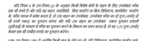 शुक्रवार 3 अक्टूबर 2025 को केंद्र सरकार ने राष्ट्रीय राजमार्ग अधिनियम 1956 (1956 का 48) की धारा 9 में दी गई शक्तियों का इस्तेमाल करके नए नियम जारी किए थे। इस नोटिस में बताया गया है कि राष्ट्रीय रकाजमार्ग फीस नियम, 2008 के नियम 6 के उप नियम 4 (2) के अनुसार, अगर कोई गाड़ी बिना फास्टैग के टोल प्लाजा में एंट्री लेता है तो उससे दो गुना फीस ली जाएगी। हालांकि, अगर वह व्यक्ति यूपीआई से पेमेंट करता है तो वह 1.25 गुना ही भुगतान करेगा।