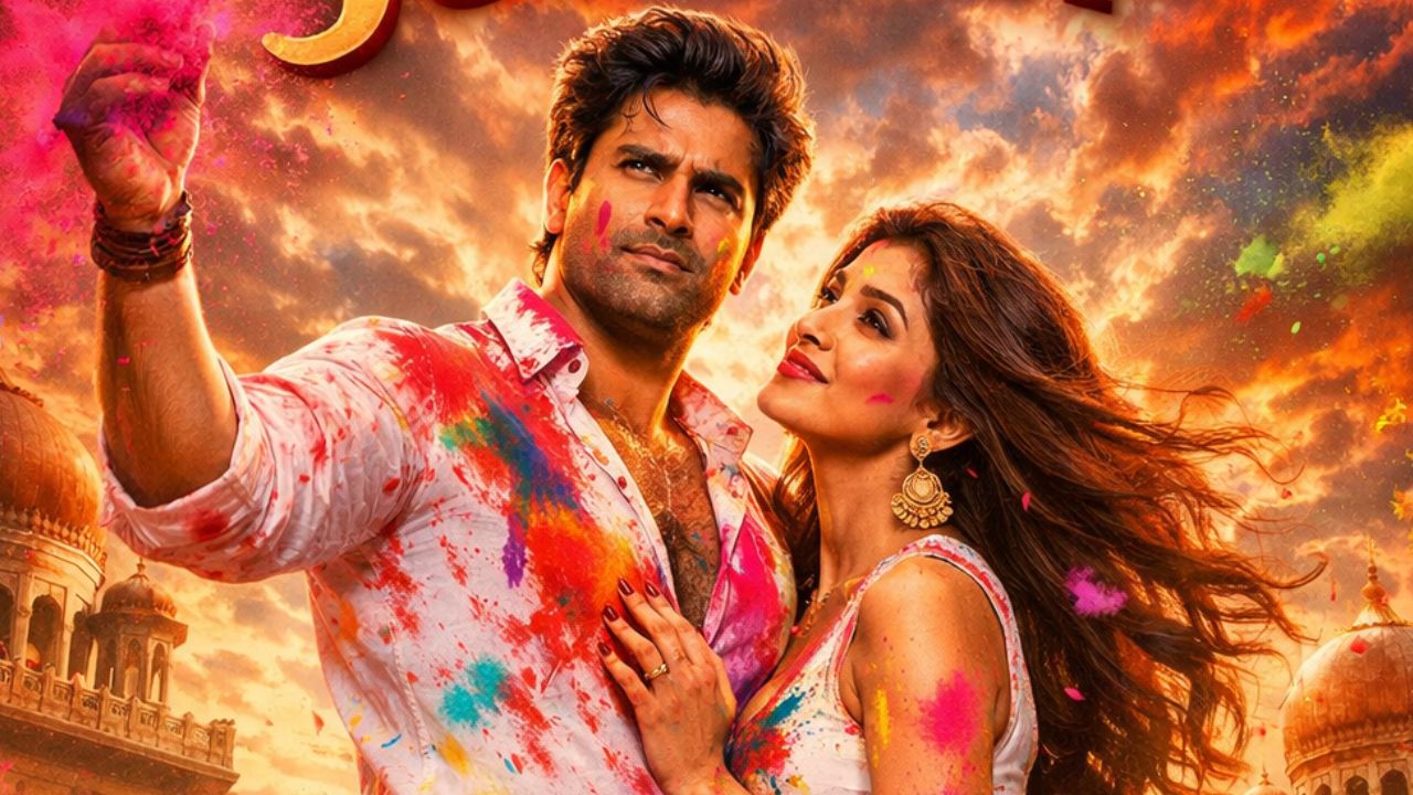 Turn this selfie into a grand Bollywood Holi poster inspired by Bollywood scenes, vibrant gulal clouds, royal palace background, dramatic lighting, intense expression, cinematic colour grading. Convert this selfie into a larger-than-life Bollywood Holi movie poster, dramatic sky, flying colours, palace courtyard, heroic pose.