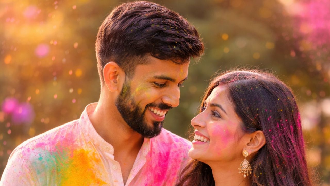 “Transform the uploaded couple photo into a cinematic Holi romance moment. Keep their faces natural and expressive. Add vibrant Holi colors (pink, yellow, green, blue) softly and realistically on their cheeks, hair, and clothes. Change their outfits into traditional Indian attire, the woman in a colorful lehenga or light saree with minimal embroidery, and the man in a classic white or pastel kurta. Add soft airborne gulal particles around them for a dreamy festive vibe. Use warm sunlight, soft shadows, and light bokeh to create a cinematic romantic mood. Maintain skin texture and photo realism.”