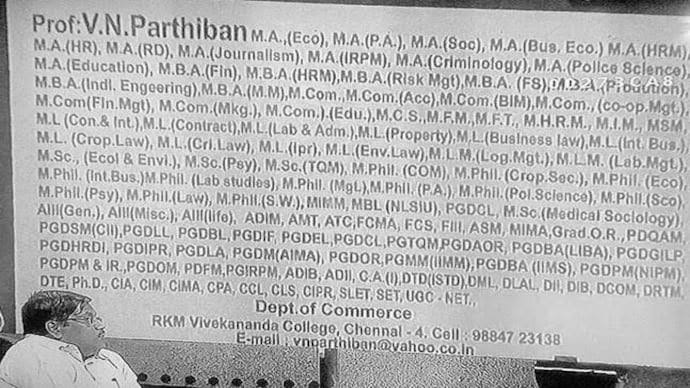 प्रोफेसर डॉ.वी.एन पार्थिबन की उपलब्धियां आपको हैरान कर देंगी। उन्होंने पिछले चार दशकों में 150 से ज्यादा डिग्रियां और डिप्लोमा हासिल किए हैं। उनकी डिग्रियों और डिप्लोमा की गिनती इतनी है कि कई यूनिवर्सिटी इतने कोर्स भी नहीं करवाती होंगी। उनके पास अर्थशास्त्र, पब्लिक एडमिनिस्ट्रेशन, राजनीति विज्ञान और लॉ जैसे सब्जेक्ट्स में कई मास्टर डिग्रियां हैं। उन्होंने अब तक कुल 12 MPhil डिग्रियां की हैं और अब तक वह तीन पीएचडी पूरी कर चुके हैं। इस समय वह अपनी चौथी पीएचडी कर रहे हैं।
