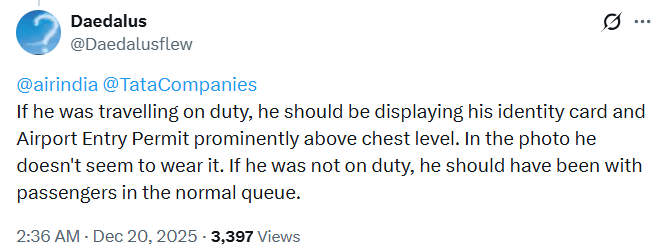सोशल मीडिया पोस्ट में यात्री ने बतया कि वह अपने परिवार के साथ छु्ट्टी मनाने जा रहा था। वह अपने परिवार के साथ थे, जिसमें एक सात सात की बेटी, चार महीने का नवजात बच्चा और उनकी पत्नी शामिल थे। एयरपोर्ट स्टाफ ने चार महीने के बच्चे को देखकर उन्हें बोर्डिंग के लिए उस कतार में भेज दिया जिससे स्टाफ बोर्डिंग करता है। सिक्योरिटी चेक के दौरान स्टाफ उन्हें नजरअंदाज करके लाइन तोड़कर आगे निकल जा रहा था। उन्होंने लिखा, 'जब मैंने उन्हें टोका तो कैप्टन वीरेंद्र ने मुझसे बहस की। वह खुद भी लाइन तोड़कर आगे बढ़ रहे थे। उन्होंने मुझसे पूछा कि क्या मैं अनपढ़ हूं और क्या मैं उन साइन बोर्ड को नहीं पढ़ सकता जिन पर लिखा था कि यह एंट्री गेट स्टाफ के लिए है।'