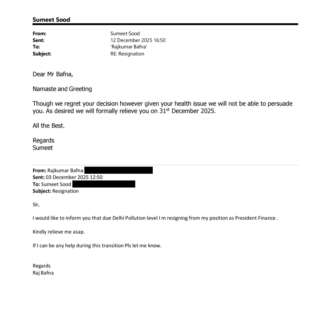 राजकुमार बाफना के इस लेटर का जवाब देते हुए चीफ फाइनेंशियल ऑफिसर सुमीत सूद ने बाफना के इस्तीफे को मंजूर कर लिया। जवाब में सुमीत सूद ने लिखा कि कंपनी 31 दिसंबर 2025 को राजकुमार काफना को औपचारिक रूप से रिलीव कर देगी। उन्होंने लिखा, 'हमें आपके इस फैसले से दुख है लेकिन आपकी सेहत की दिक्कतों को देखते हुए हम आपको मना नहीं कर पाएंगे।' इस लेटर की एक कॉपी सोशल मीडिया पर वायरल हो रही है। कुछ लोग राजकुमार बाफना के इस्तीफे को सही ठहरा रहे हैं और लिख रहे हैं कि दिल्ली में रहना अब मुश्किल हैं।