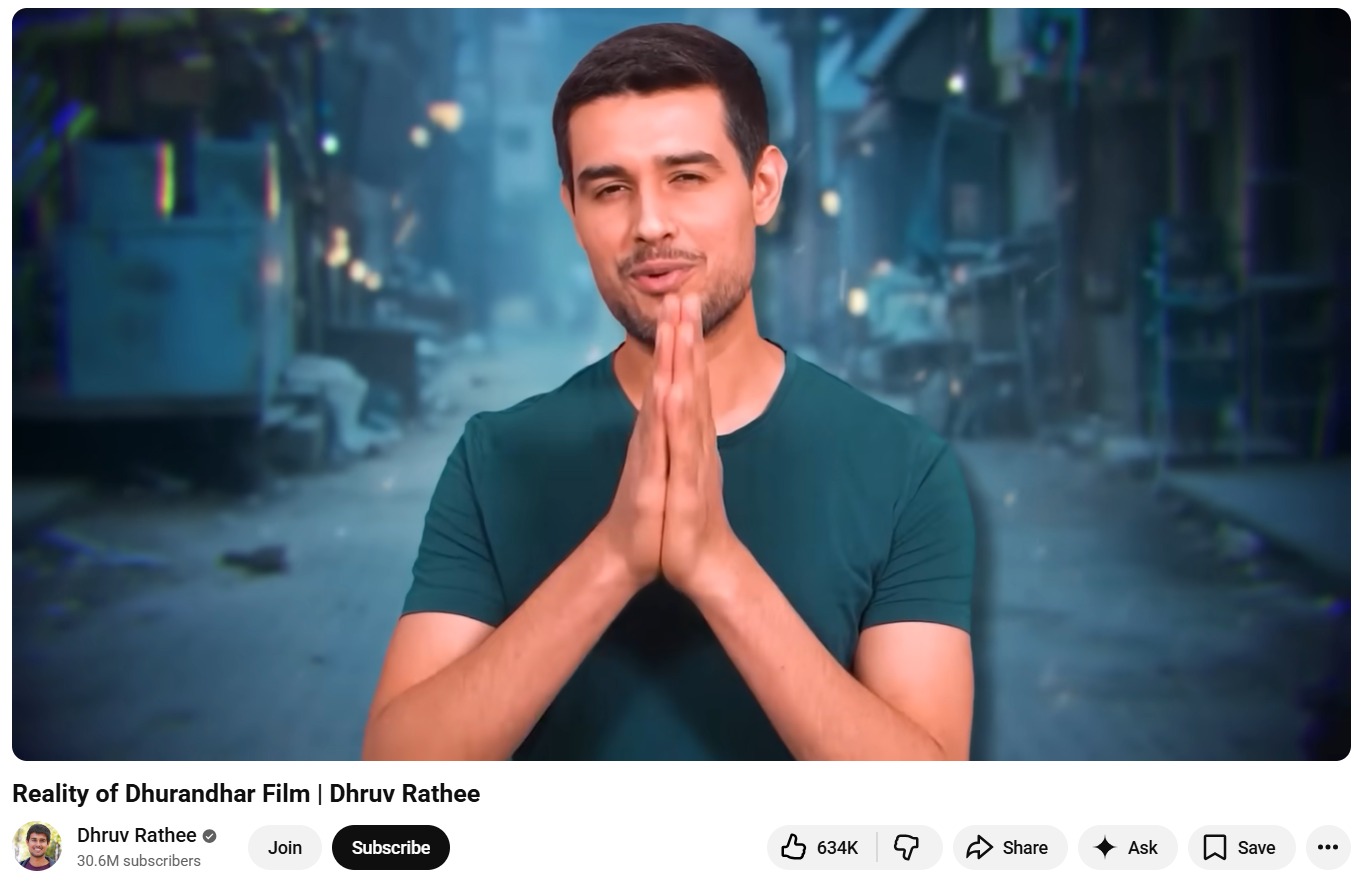 इसके बाद 20 दिसंबर को ही ध्रुव राठी ने यूट्यूब चैनल पर वीडियो रिलीज किया। उन्होंने 'Reality of Dhurandhar Film' नाम से यह वीडियो रिलीज किया। 29 मिनट 31 सेकंड के इस वीडियो में उन्होंने इस फिल्म को 'प्रोपेगैंडा' बताया।