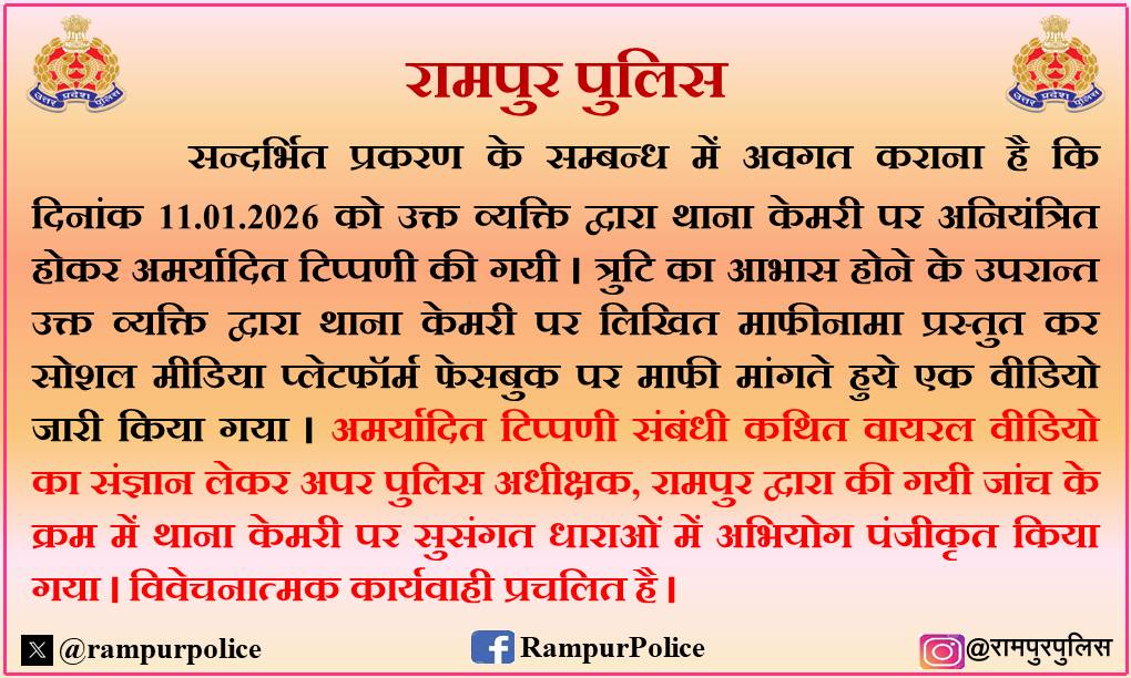 उत्तर प्रदेश के रामपुर में बजरंग दल के एक कार्यकर्ता का वीडियो सोशल मीडिया पर वायरल हो रहा है। इस वीडियो में बजरंग दल का कार्यकर्ता पुलिस को धमकी दे रहा है। वह कार्यकर्ता कैमरे पर ही पुलिस वालों को गाली दे रहा है और साथ में धमकी दे रहा है कि वह पुलिस थाने में आग लगा देगा। पुलिस अधिकारियों का कहना है कि वह आदमी बिना अनुमति के हिरासत में लिए गए व्यक्ति से मिलने की कोशिश कर रहा था। पुलिस ने अब इस वीडियो पर संज्ञान लेने के बाद आरोपी व्यक्ति के खिलाफ FIR दर्ज कर ली है।