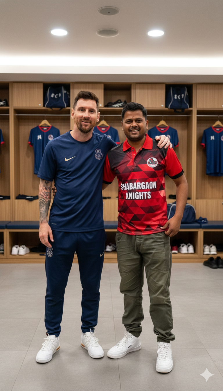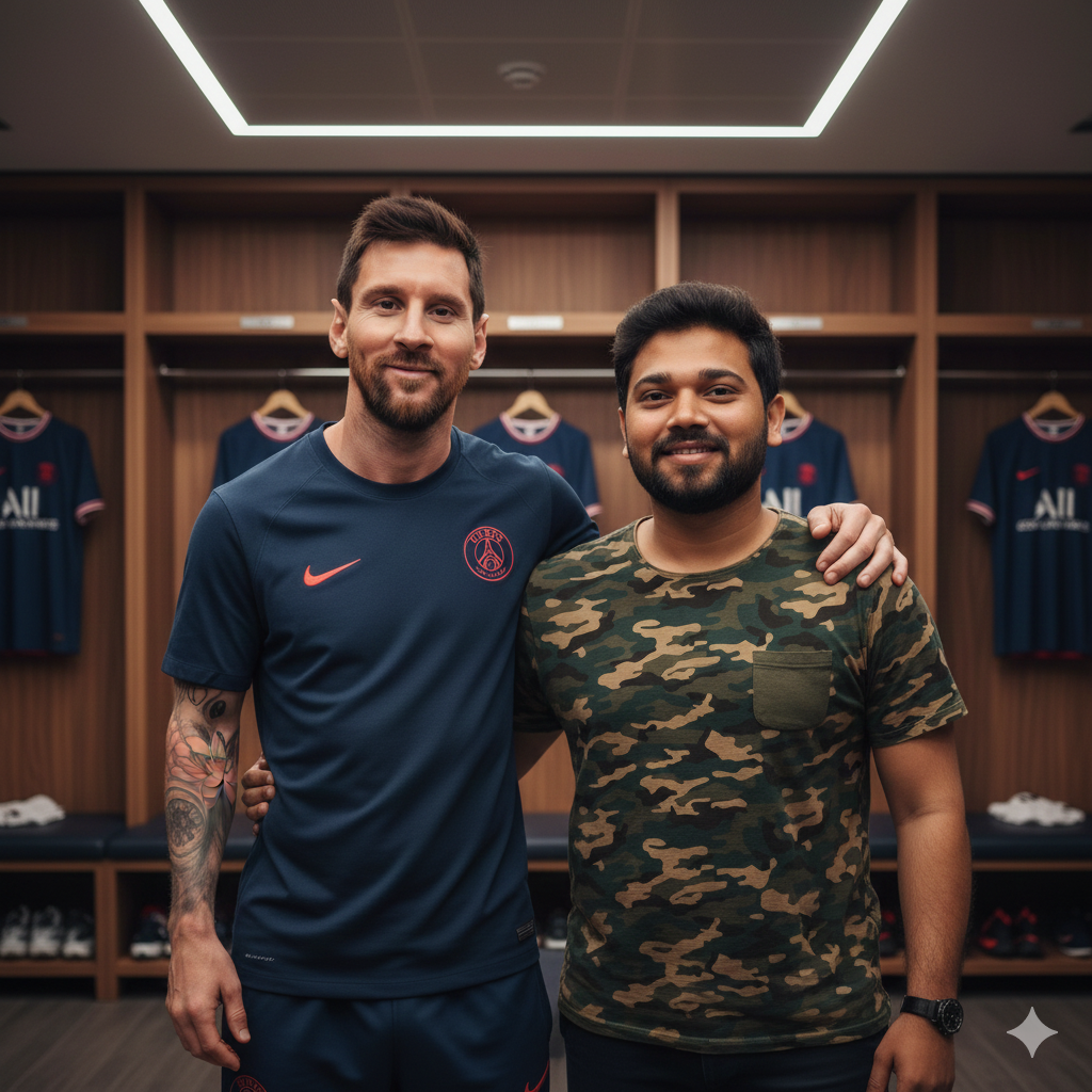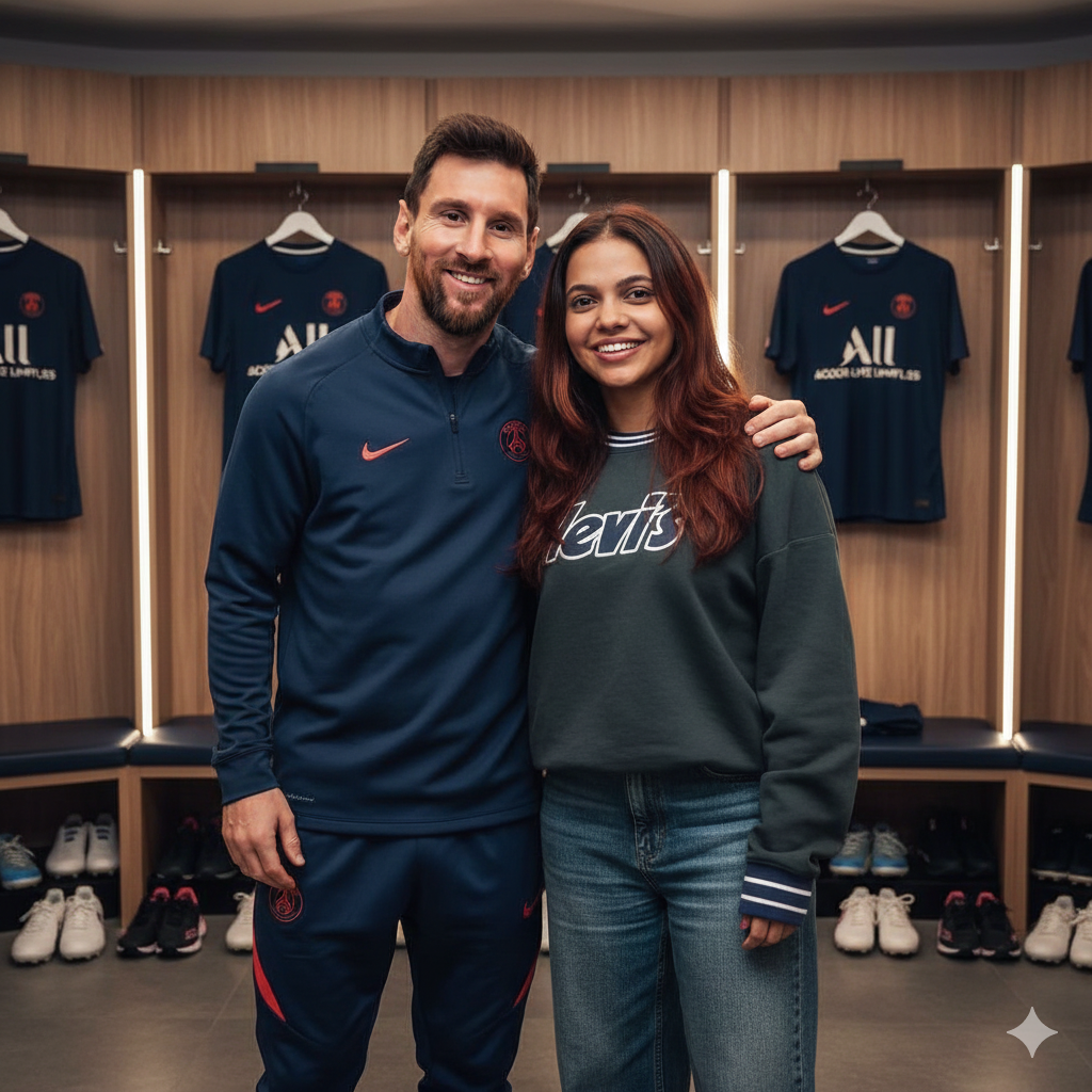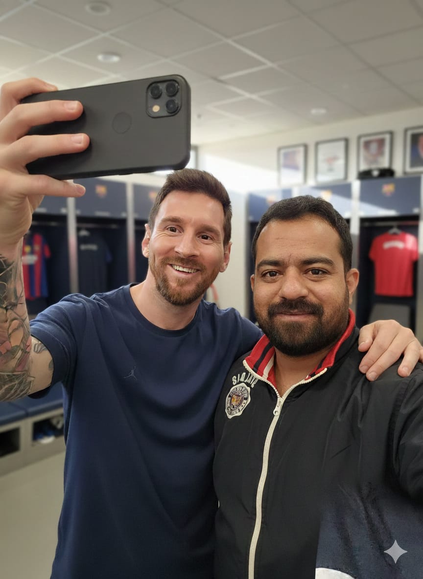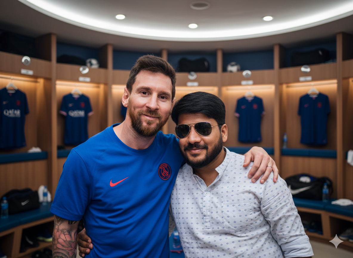 - प्रॉम्प्ट 1: A highly realistic, ultra-detailed photo of Lionel Messi posing for a picture with a fan inside a modern football locker room. Messi is smiling warmly, wearing a training jersey, with his hand resting casually on the fan’s shoulder. The fan looks exactly like the person in the provided reference image. Bright indoor lighting, natural skin tones, shallow depth of field, DSLR photography, photorealistic, 8K resolution.