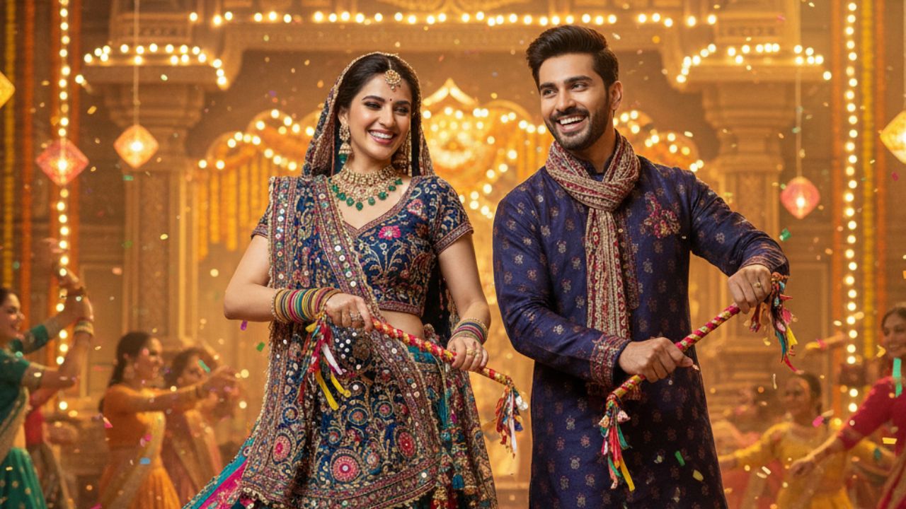 प्रॉम्प्ट -Generate a highly detailed portrait of me and my partner, both in vibrant Navratri traditional attire. The woman wears a colorful lehenga choli with intricate embroidery, while the man wears a matching kurta with detailed work. They are holding decorated dandiya sticks, with a dramatic backdrop of a colorful festival, emphasizing their festive joy and synchronized energy.