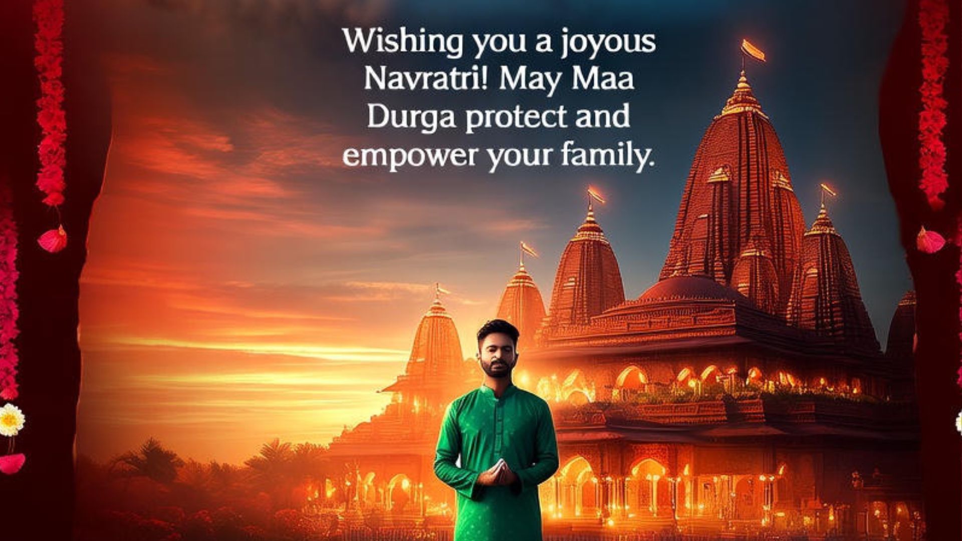 Create breathtaking 4K cinematic portrait of Maa Durga's benevolent face emerging from swirling clouds in the background, adorned with a crown of jewels and flanked by her vahana tiger, evoking the spirit of Navratri. Add elements like cascading flower petals, illuminated temples, and rhythmic dandiya sticks. In the foreground, portray me as a person standing with folded hands in a graceful, poised posture, clad in an emerald green kurta pajama with traditional motifs. Center a heartfelt text overlay: "Wishing you a joyous Navratri! May Maa Durga protect and empower your family". Please make sure the spelling is correct and the same as it is given in the quotes. Use a grand, film-like composition with vibrant reds, oranges, and intricate henna designs on the edges for added festivity. My image is uploaded as reference image and the my face must remain exactly the same as in the provided reference photo, with no alterations.'