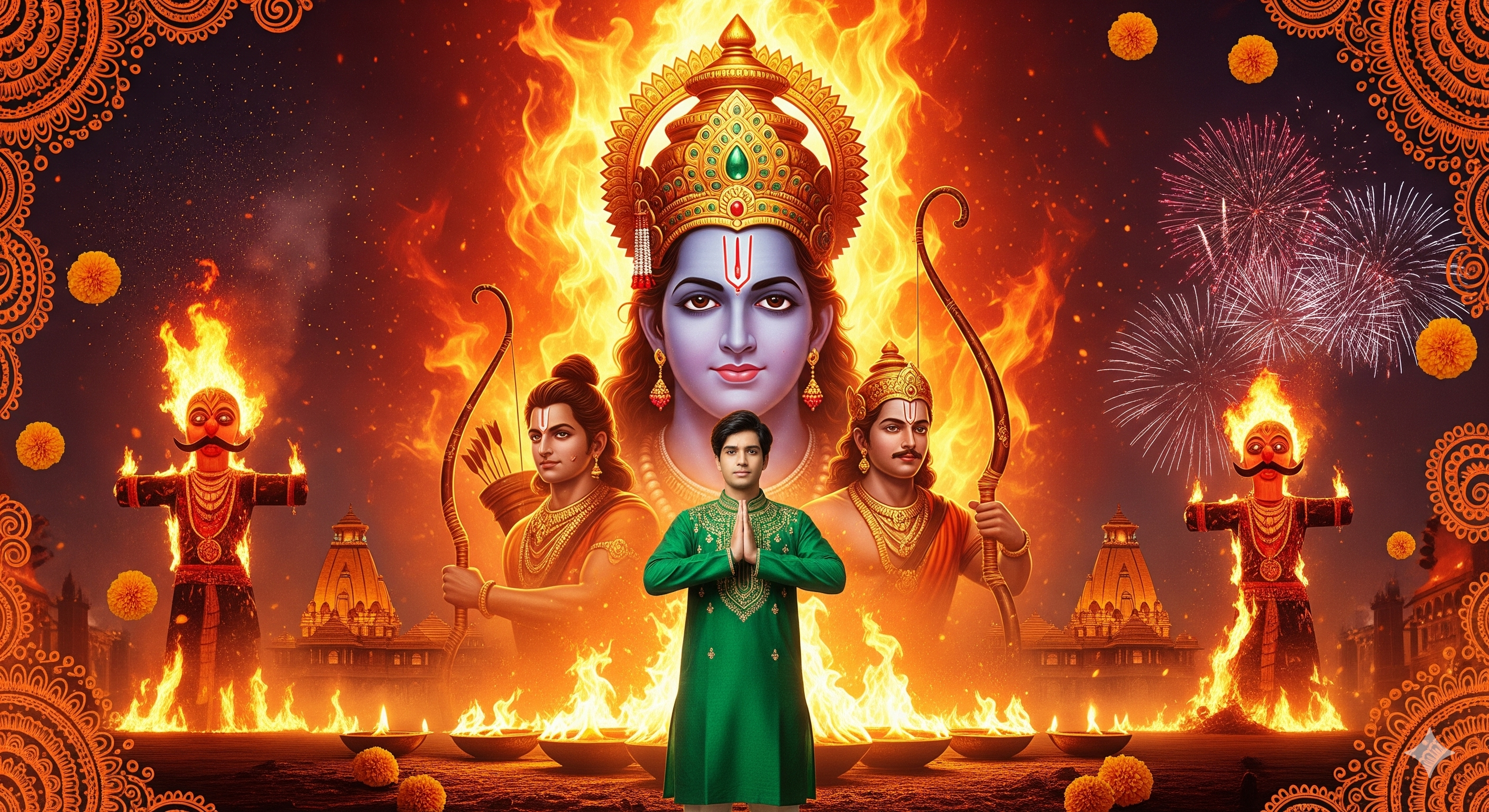 दशहरा प्रॉम्प्ट- Create a stunning 4K cinematic portrait of Lord Rama's majestic and triumphant face rising from a dramatic swirl of golden and crimson flames, crowned with an ornate royal diadem encrusted with jewels, and flanked by his loyal brother Lakshmana holding a bow, embodying the essence of Dussehra's victory over evil. Include towering burning effigies of Ravana crumbling into ashes, majestic illuminated temples aglow with oil lamps, and a spectacular burst of festive fireworks illuminating the night sky. In the foreground, portray me standing with folded hands in a poised and reverent posture, clad in an emerald green kurta pajama adorned with intricate traditional gold motifs. Ensure my face remains exactly the same as in the provided reference photo, with no alterations. Craft a grand, epic film-like composition with vibrant reds, deep oranges, and elaborate henna-inspired designs framing the edges for a festive touch, enhanced by scattered marigold flowers, swirling smoke, and the radiant glow of a victorious celebration.