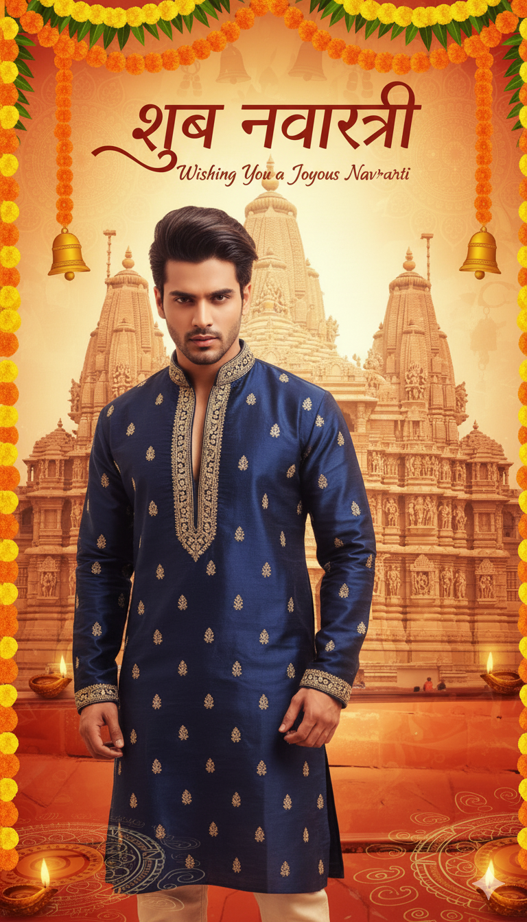 प्रॉम्प्ट- Add a festive Navratri-themed overlay to this photo. Include traditional Indian decorative elements like colorful rangoli patterns, glowing diyas (lamps), and garlands of marigold flowers. Incorporate a warm golden-orange-red color palette. Add elegant text that says 'Happy Navratri' or 'Wishing You a Joyous Navratri' in a stylish Devanagari or calligraphy font. Background should have subtle textures like mandalas or temple bells. Make it vibrant, spiritual, and joyful."