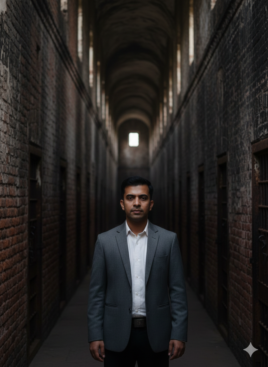 Create a highly realistic photo of the same Indian man (same person, consistent face, identical facial features across images), age 28-32, wheatish skin tone, short black hair, clean shave, wearing a white shirt with grey jacket, standing inside Cellular Jail (Kala Pani), Port Blair. Background shows long prison corridors, iron bars, historic brick walls, prison cells, dim natural light coming from windows. Ultra realistic DSLR photo, 50mm lens, sharp focus on face, cinematic depth of field, documentary photography style, high resolution.