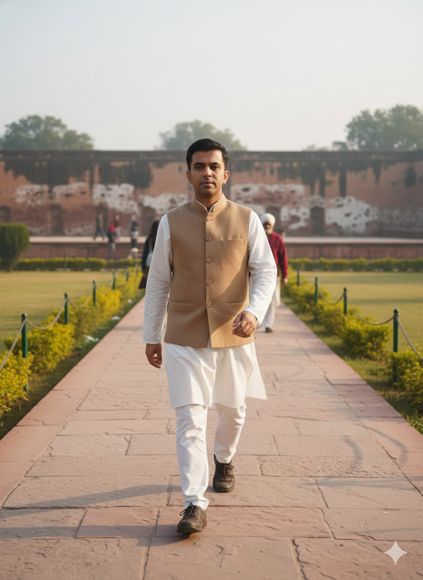 Create a highly realistic photo of the same Indian man (same person, consistent face, identical facial features across images), age 28-32, wheatish skin tone, short black hair, clean shave, wearing a white kurta with a light brown Nehru jacket, walking inside Jallianwala Bagh memorial, Amritsar. Background shows the memorial garden pathway, historic walls, visitors, soft morning light, calm documentary vibe. DSLR 50mm lens, ultra realistic, sharp focus on face, cinematic depth of field, natural skin texture, high resolution.