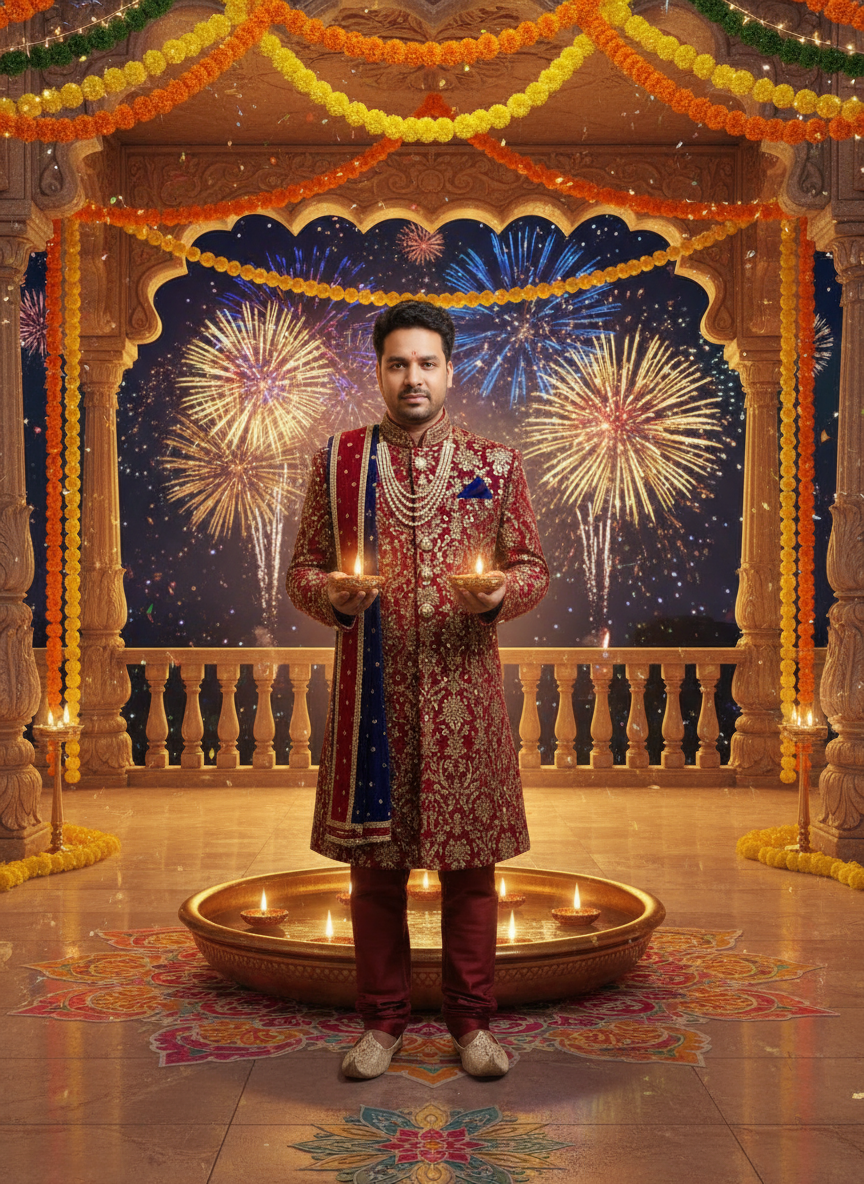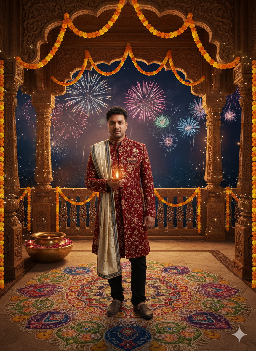 Remove the entire original background completely and replace it with an aesthetic Diwali background: a luxurious mandap or balcony decorated with rangoli patterns on the floor, strings of marigold flowers and fairy lights, floating diyas in water, fireworks bursting in the night sky, and subtle sparkles for a magical festive vibe. Make it highly detailed, cinematic lighting with golden hour glow, bokeh effects from lights, and a dreamy, elegant atmosphere. Ensure the person's face, pose, and features are preserved perfectly from the original photo, with flawless skin retouching, sharp details, and natural integration into the new attire and background. Ultra-realistic, high resolution, photorealistic, 8k quality, no artifacts, seamless blending."