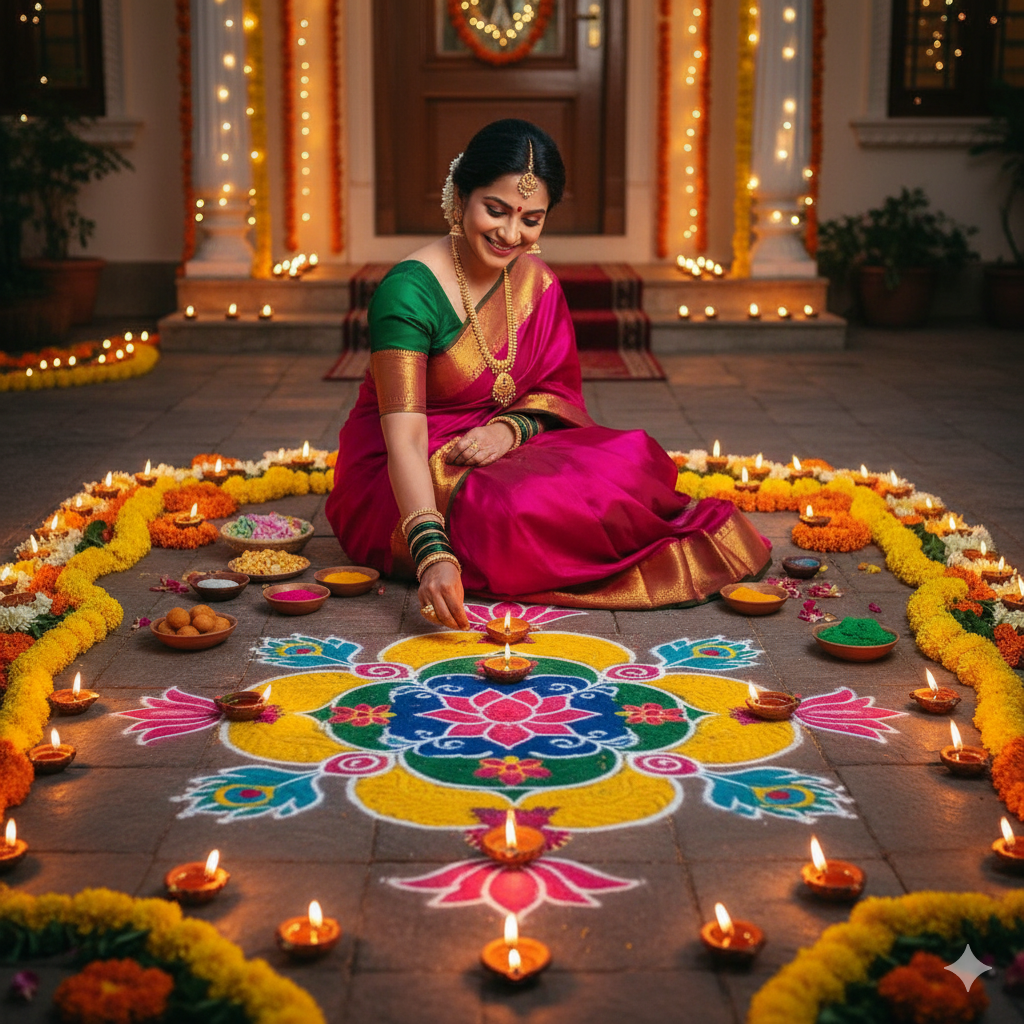 प्रॉम्पट- "A vibrant and festive scene of a beautiful Indian woman in her mid-30s, sitting cross-legged on the floor in a traditional saree with intricate jewelry, carefully creating a colorful rangoli design using powdered colors, rice, and flowers for Diwali celebration. The rangoli features symmetrical patterns with diyas, lotus flowers, and peacock motifs in bright hues of red, yellow, green, and blue. She is smiling joyfully, surrounded by lit oil lamps (diyas), marigold garlands, and sweets on a decorated home courtyard at dusk, with warm glowing lights and a sense of cultural joy and tradition in the air. High detail, realistic style, warm lighting, 4K resolution."