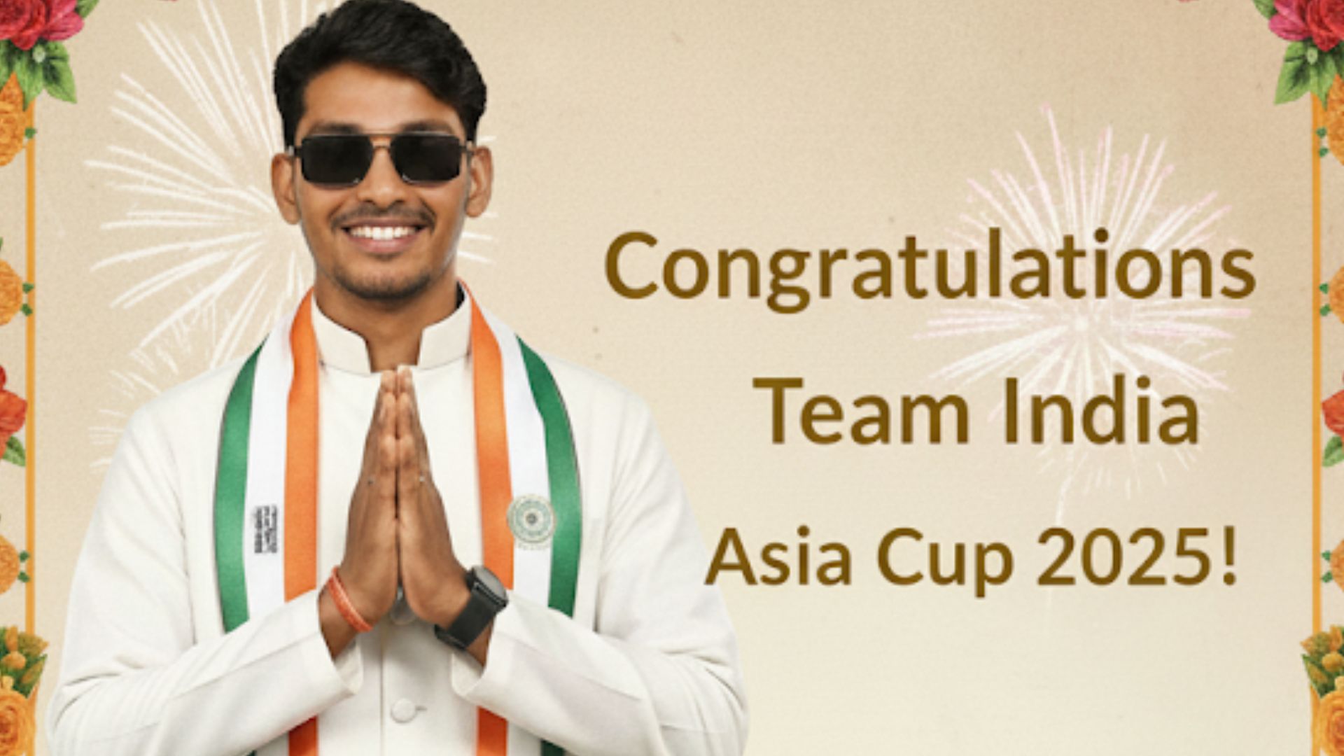 प्रॉम्प्ट- "Create a vibrant, high-resolution political-style poster featuring my uploaded photo, congratulating the Indian cricket team for their 2025 Asia Cup final victory over Pakistan by 5 wickets. Design the poster in a bold, celebratory layout typical of Indian political posters, with bright colors (saffron, white, green, and blue), floral garlands, and decorative borders. Place my image prominently at the top center, smiling confidently in a formal outfit (white kurta-pajama with a tricolor sash), hands folded in a congratulatory gesture. Below me, include real images of Indian cricket team players like Shubman Gill (captain, holding the trophy), Tilak Varma (Player of the Match, smiling), Abhishek Sharma, Suryakumar Yadav, and Kuldeep Yadav in their blue jerseys, arranged in a dynamic group pose celebrating at Dubai International Cricket Stadium under floodlights, with fireworks and the Burj Khalifa in the background. Add bold Hindi text at the top in large gold font: 'भारत क्रिकेट टीम को एशिया कप 2025 की शानदार जीत पर हार्दिक बधाई!' and smaller English text below: 'Congratulations Team India for Winning Asia Cup 2025!' Include my name at the bottom in bold white text on a saffron strip: '[Your Name], Proud Supporter of Team India.' Ensure seamless blending of my photo with realistic lighting, shadows, and proportions to match the players, with no AI artifacts. The poster should be 4K, vertical, with a festive, professional look like a high-quality political campaign banner."