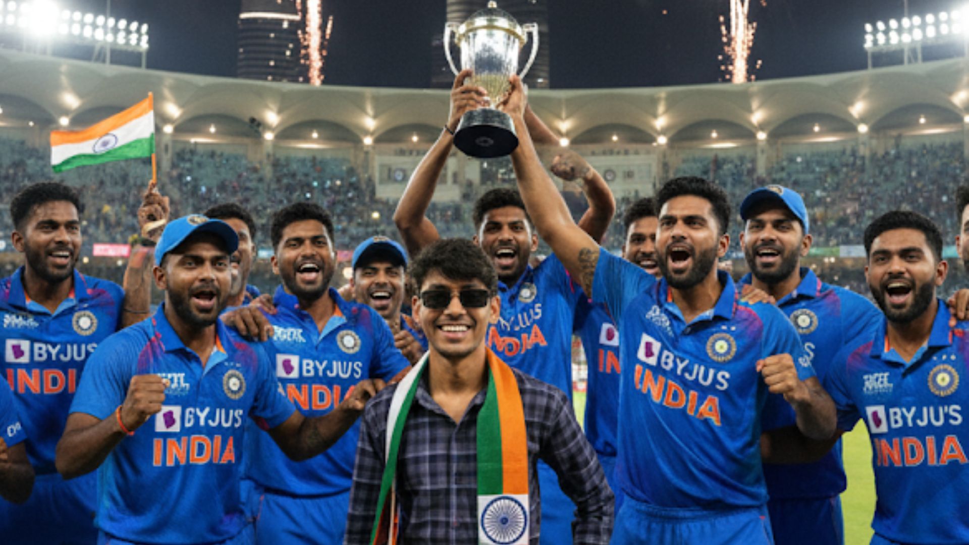 प्रॉम्प्ट- "Edit my uploaded photo to seamlessly insert me into a highly realistic scene of the Indian cricket team celebrating their 2025 Asia Cup final victory over Pakistan by 5 wickets at Dubai International Cricket Stadium at night, under floodlights with fireworks bursting in the sky and the Burj Khalifa glowing in the background. Place me in a Team India fan jersey, jeans, and Indian flag scarf, standing between Suryakumar Yadav (holding the trophy high, smiling triumphantly) and Tilak Varma (fist-pumping, as Player of the Match), grinning excitedly with an arm around SKY's shoulder. Include key players like Kuldeep Yadav (cheering with arms raised, after his 4-wicket haul), Shivam Dube, Rinku Singh, and Abhishek Sharma in blue jerseys, sweaty and ecstatic in a huddle with confetti falling, waving flags, and a roaring crowd in the stands. Ensure perfect night lighting, shadows from floodlights, realistic proportions, skin tones, and details like jersey creases, sweat on faces, and motion blur on fireworks for a photorealistic 4K professional sports photo—no AI artifacts, like a candid Nikon shot."
