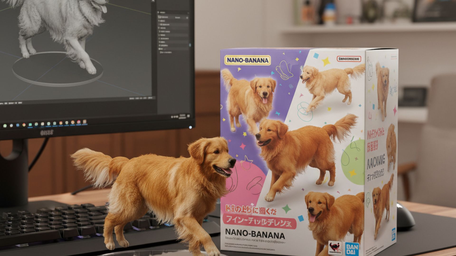 प्रॉम्प्ट- 'Using the nano-banana model, create a 1/7 scale commercialised figurine of the characters in the picture, in a realistic style, in a real environment. The figurine is placed on a computer desk. The figurine has a round transparent acrylic base, with no text on the base. The content on the computer screen is the brush modelling process of this figurine. Next to the computer screen is a BANDAI-style toh packaging box printed with original artwork., the packaging features two-dimensional flat illustrations. Please turn this photo into a figure. Behind it, there should be a model packaging box with the character from this photo printed on it. In front of the box. On a round plastic base place the figure version of the photo i gave you. Id like the PVC material to be clearly represented. It would be even better if the background is indoors.'