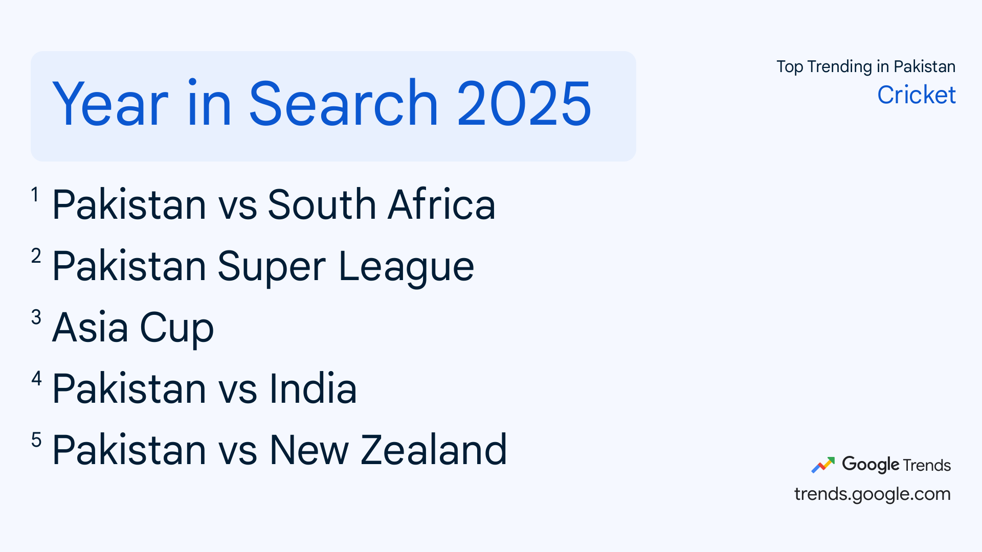 भारत की तरह ही पाकिस्तान में भी क्रिकेट सबसे ज्यादा पसंद किया जाने वाला खेल है। पाकिस्तान में क्रिकटे कैटेगरी में सबसे ज्यादा पाकिस्तान और साउथ अफ्रीका का मैच सर्च किया गया है। इसके बाद पाकिस्तान सुपर लीग और एशिया कप को सर्च किया गया है।