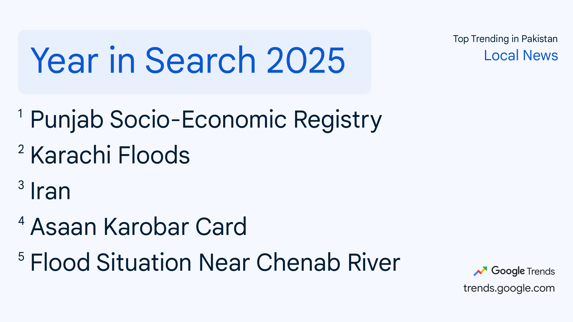 गूगल ट्रेंड्स से पता चलता है कि लोग गूगल पर क्या सर्च कर रहे हैं। गूगल एक सर्च इंजन है और गूगल ट्रेंड्स से सिर्फ गूगल पर सर्च की गई चीजों की जानकारी ही मिलती है। गूगल ट्रेंड्स के पिछले 12 महीनों के डेटा के हिसाब से अलग-अलग कैटेगरी में सर्च की गई चीजों के बारे में बताया है। गूगल पर इस साल पाकिस्तान की कई बड़ी घटनाओं को सर्च किया गया, जिसमें पाकिस्तान की बाढ़ सबसे ज्यादा सर्च की गई है।