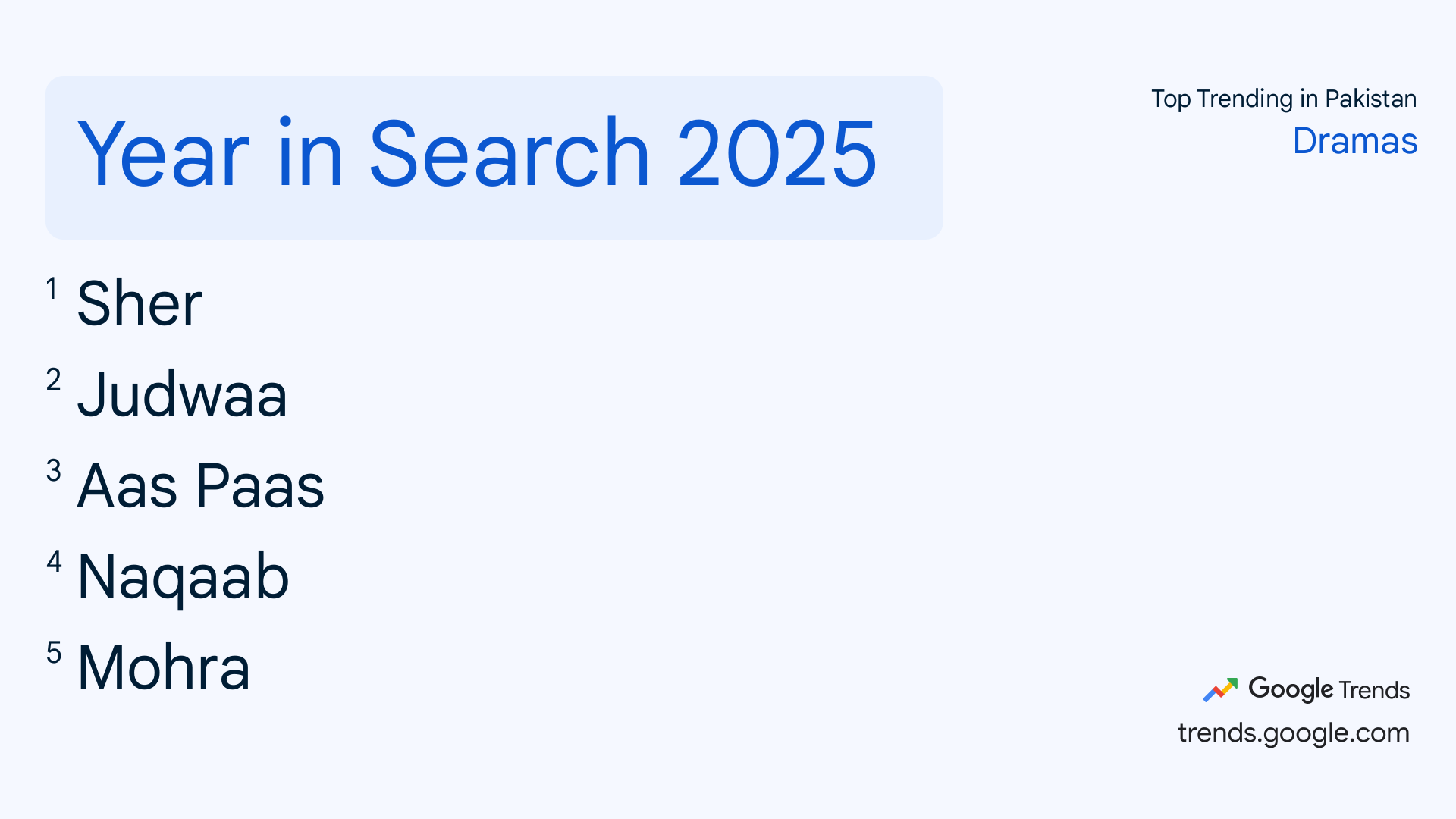 गूगल ट्रेंड्स ने इस साल के टॉप ट्रेंडिंग का डेटा रिलीज कर दिया है। इससे यह पता चलता है कि सालभर गूगल पर किसी देश के लोगों ने सबसे ज्यादा क्या सर्च किया। गूगल ट्रेंड्स के डेटा में पता चला है कि पाकिस्तान ने भारतीय क्रिकेटर अभिषेक शर्मा को गूगल पर सबसे ज्यादा सर्च किया। इसी तरह हर एक फील्ड में पाकिस्तान ने क्या सर्च किया है यह डेटा सामने आया है।