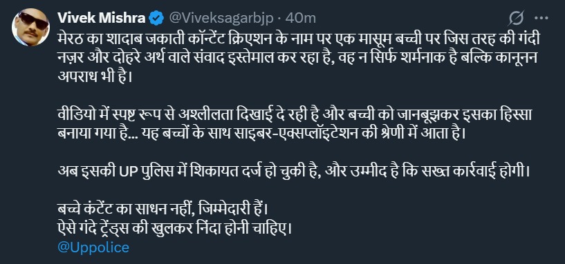 उन्होंने आगे लिखा, 'वीडियो में अश्लीलता दिखाई दे रही है और बच्ची को जानबूझकर इसका हिस्सा बनाया गया है। यह बच्चों के साथ साइबर एस्प्लॉइटेशन है। अब इसकी यूपी पुलिस में शिकायत दर्ज हो चुकी है और उम्मीद है कि सख्त कार्रवाई की जाएगी।'
