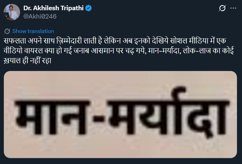 डॉक्टर अखिलेश त्रिपाठी नाम के यूजर ने लिखा, 'सफलता अपने साथ जिम्मेदारी लाती है लेकिन अब इनको देखिए सोशल मीडिया में एक वीडियो वायरल क्या हो गई, जनाब आसमान पर चढ़ गए। मान-मर्यादा, लोक-लाज का कोई ख्याल ही नहीं रहा।'