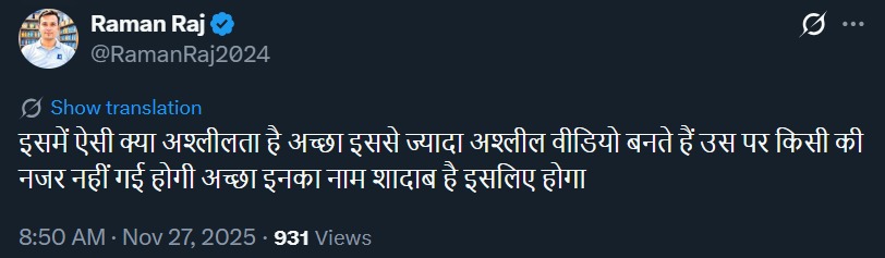 हालांकि, कुछ यूजर ऐसे भी हैं जो इस वीडियो पर शादाब के साथ खड़े नजर आ रहे हैं। रमन राज नाम के यूजर ने लिखा, 'इसमें ऐसी क्या अश्लीलता है। अच्छा इससे ज्यादा अश्लील वीडियो बनते हैं, उस पर किसी की नजर नहीं गई होगी। अच्छा इनका नाम शादाब है, इसलिए होगा।'